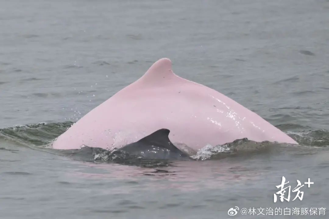 “我们常年在附近冲浪,但这是第一次如此清晰地目睹一大一小两只中华白海豚同框共游。”有冲浪爱好者表示。