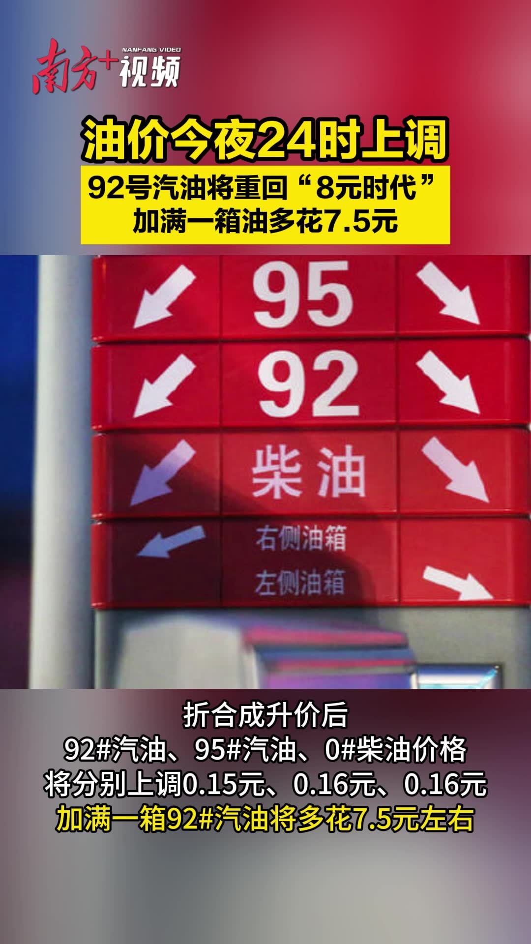油价今夜24时上调!92号汽油将重回“8元时代”,加满一箱油多花7.5元