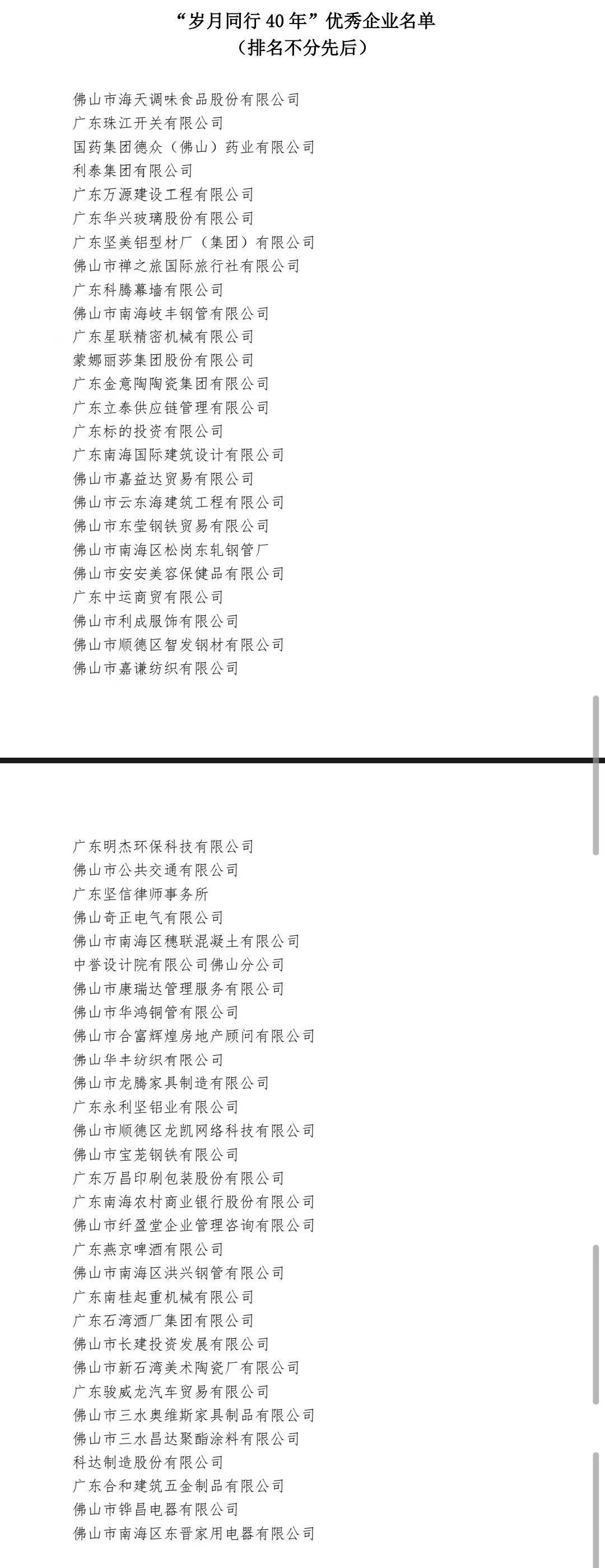 “岁月同行 40 年”优秀企业名单 (排名不分先后)