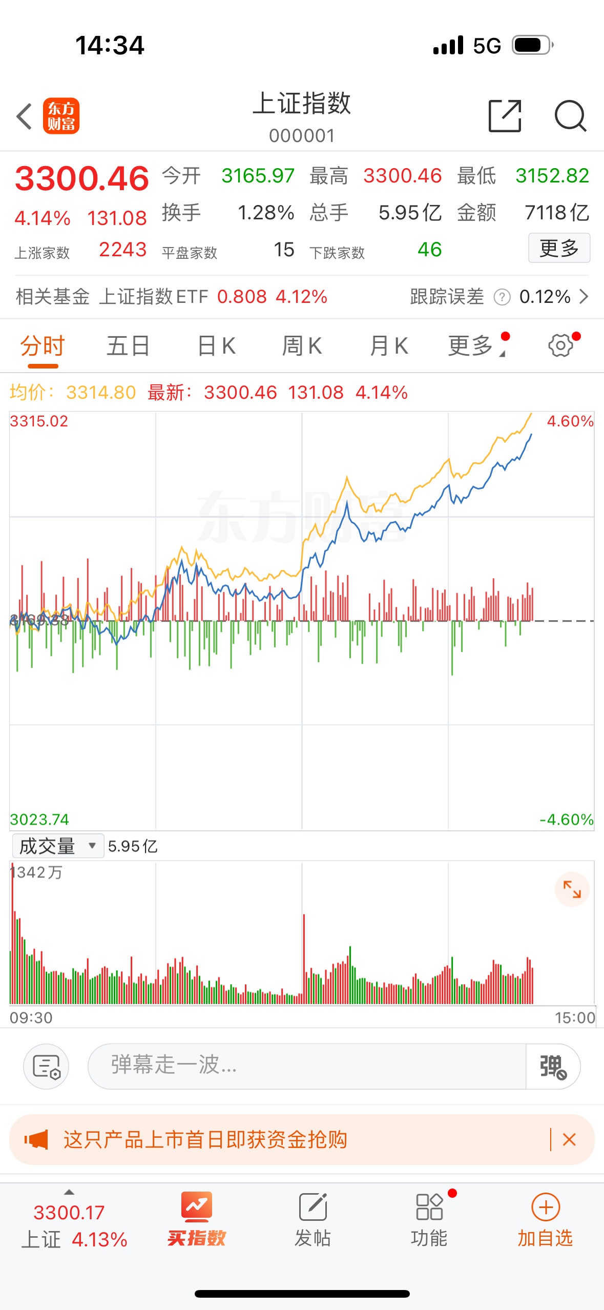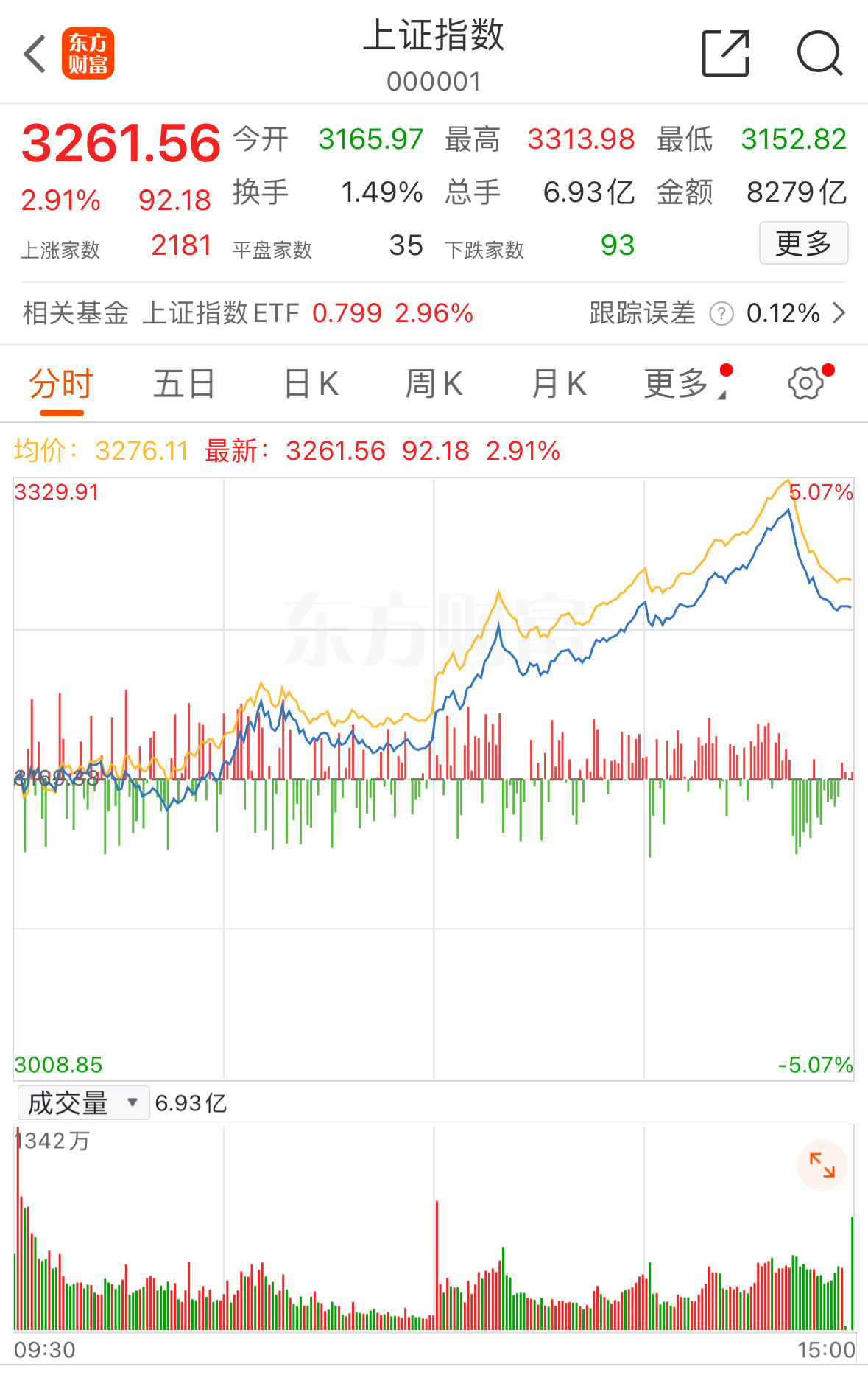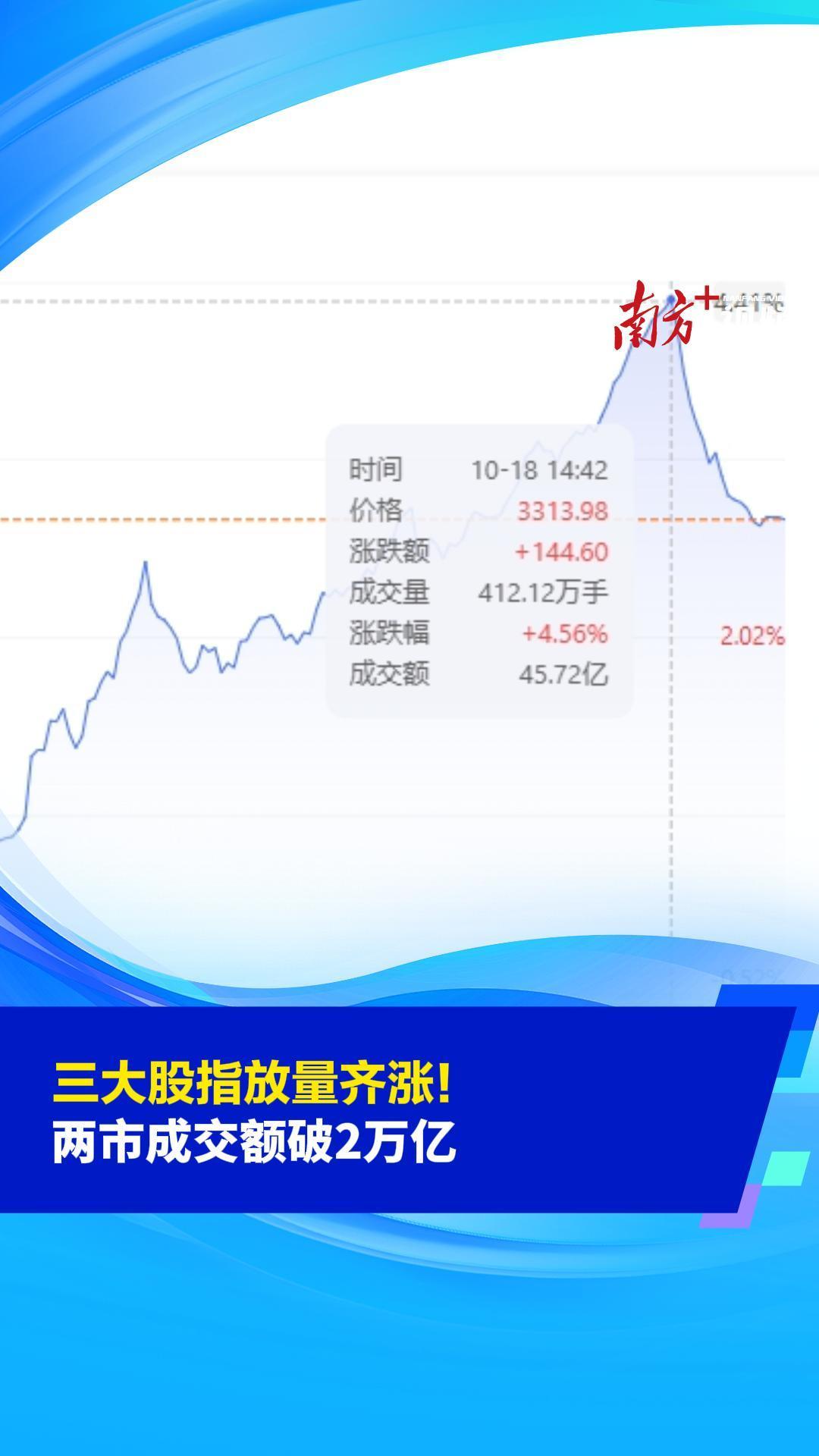 18日,A股三大指数集体大涨,截至收盘,沪指涨2.91%,深证成指涨4.71%,创业板指涨7.95%。沪深两市成交额突破两万亿元,较17日大幅放量近6000亿元,上涨股票数量超过5000只。