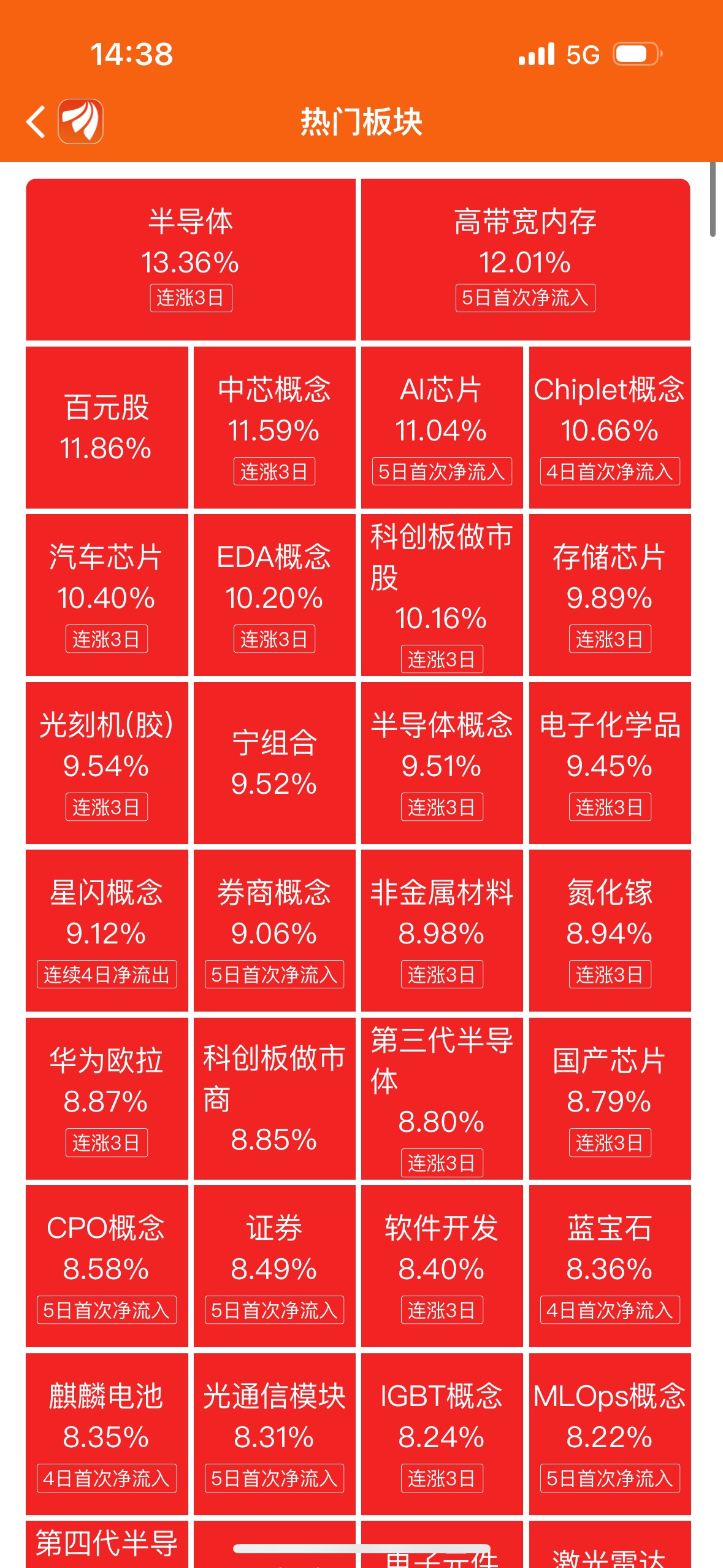 行业板块全线上涨,半导体、非金属材料、电子化学品、电子元件、软件开发、电池、证券、光学光电子、消费电子、通信设备、仪器仪表板块涨幅居前。
