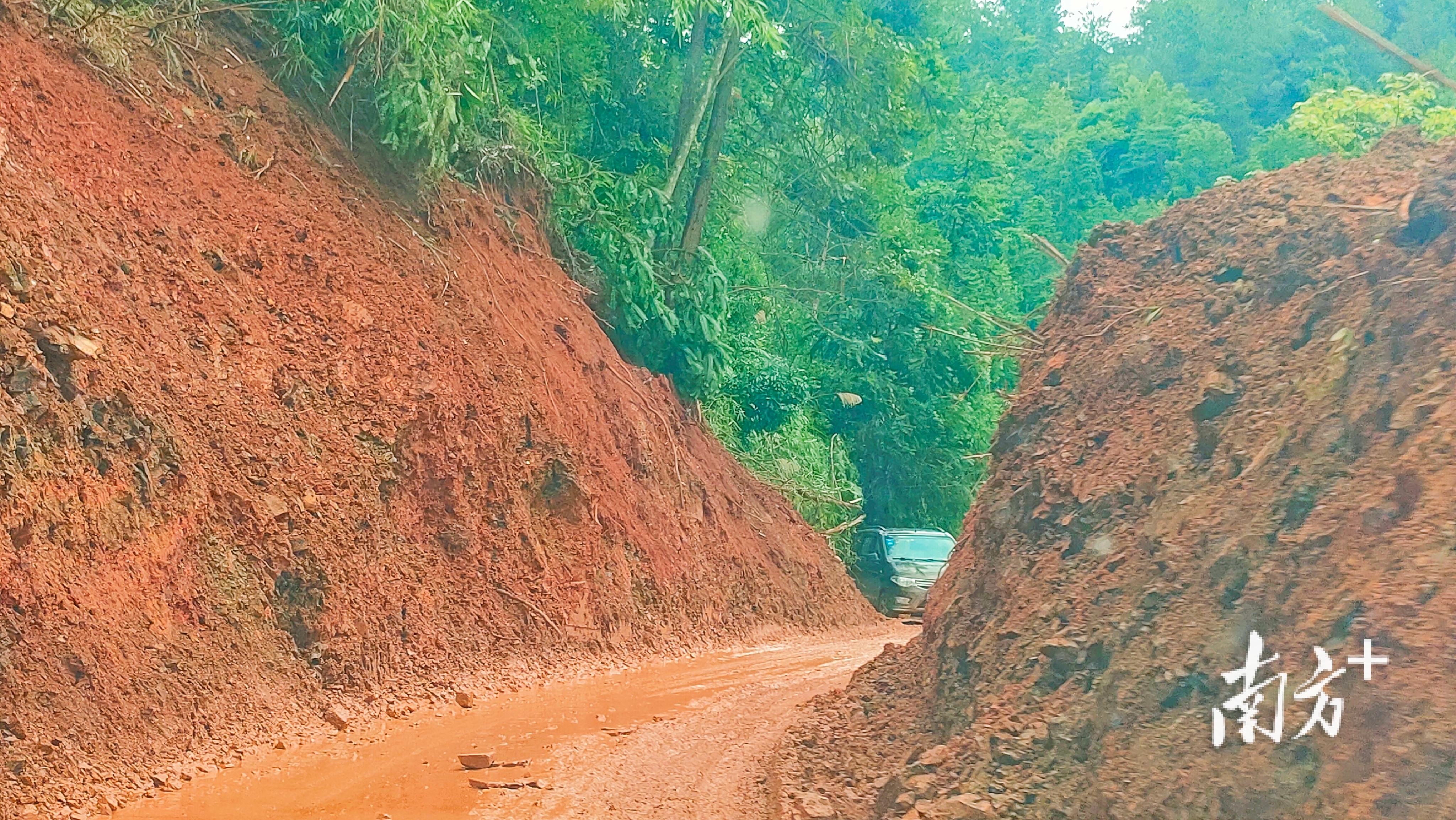 经过一天一夜的紧张抢险救援,如今由蕉岭县城前往蓝坊镇、南磜镇的道路已然打通。乘车驶入南磜镇中,沿途县道公路上仍随处可见山林坍塌,部分路段上仍有土方堆积,本就狭窄的车道仅剩下一条车道可通行。这些景象,诉说着洪水为这座小镇带来的冲击。