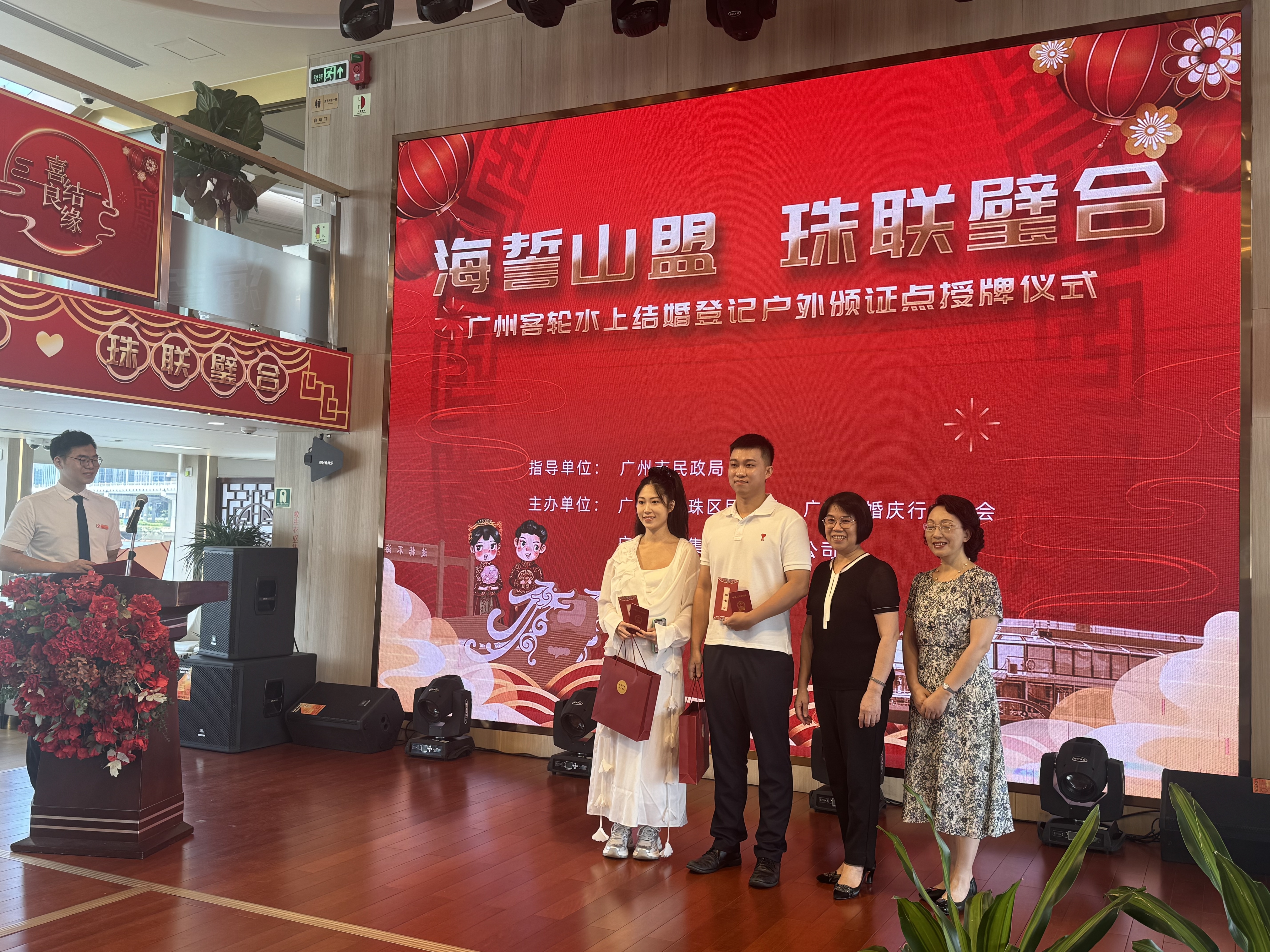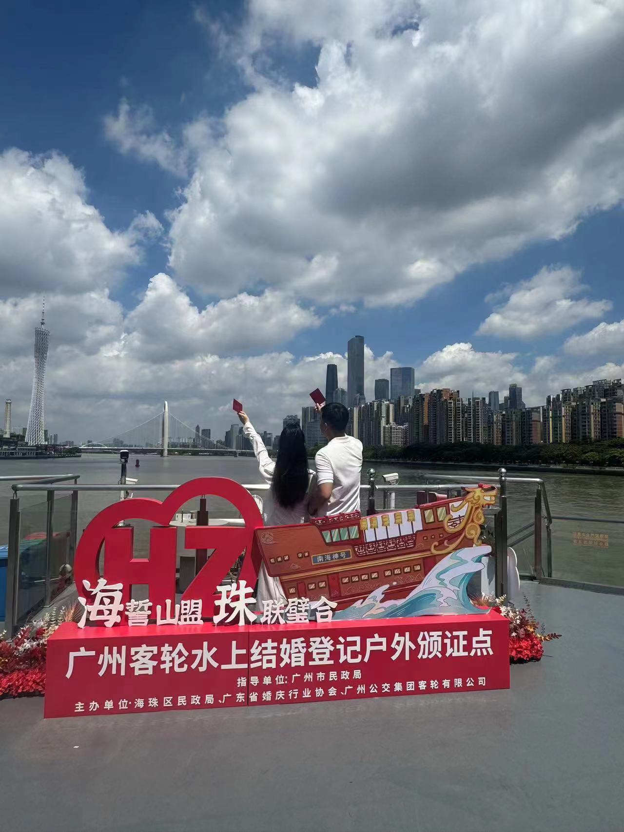 珠江碧波之上,新人携手许下永恒的誓言。7月9日,全国首个水上结婚登记户外颁证点在广州琶洲会展中心码头“鹅潭印象号”游船揭幕,广州客轮正式加入广州海珠特色结婚登记户外颁证点行列,为新人提供了一个在广州珠江母亲河见证下宣誓的独特颁证场景,更有“百年修得同船渡”的美好寓意和祝福,甜蜜氛围拉满。