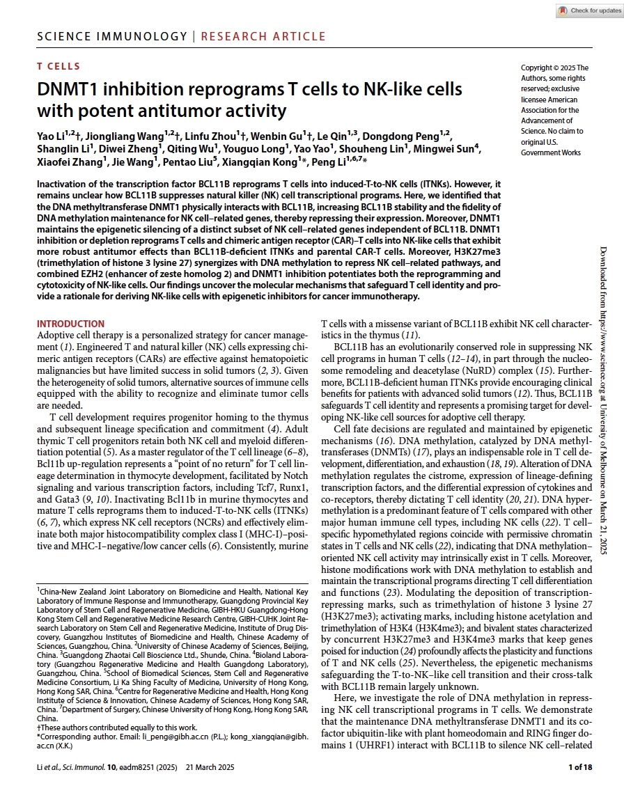 3月22日,位于佛山市顺德区的生物医药公司——广东昭泰细胞生物科技有限公司(以下简称“广东昭泰”)的最新研发成果在国际顶尖权威期刊《Science Immunology》(《科学免疫学》)上发表,题为“DNMT1 inhibition reprograms T cells to NK-like cells with potent antitumor activity”,引发学术界广泛关注。