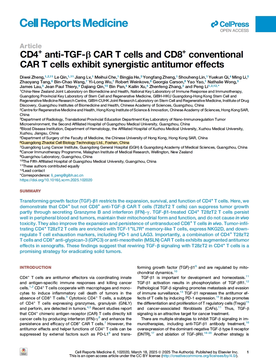 3月17日,广东昭泰的另一项研究成果在国际顶尖权威期刊《Cell Reports Medicine》上发布,这项成果题为“CD4+ anti-TGF-β CAR T cells and CD8+ conventional CAR T cells exhibit synergistic antitumor effects”。