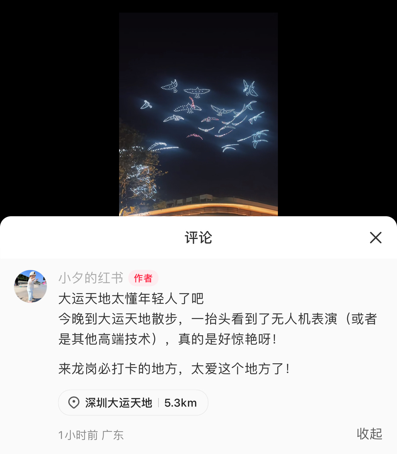 “第一次到新开业的大运天地夜游,就近距离看到了大型无人机表演,太棒了!”家住龙岗的市民张先生在朋友圈点赞这一体验。