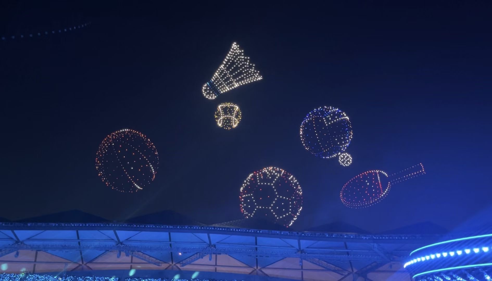 当晚20时,闪烁着霓虹灯的2000架无人机腾飞高空,变换出12个不同造型,用一场别出心裁的表演串联起龙岗大运片区的过去、现在与未来。
