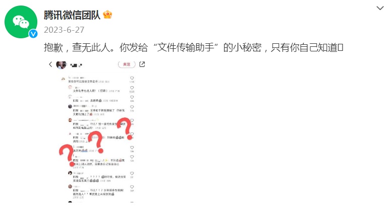 2023年6月27日,@腾讯微信团队 回应称:抱歉,查无此人。你发给“文件传输助手”的小秘密,只有你自己知道。