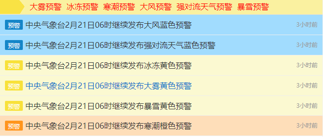 是的,在21日早上6时,中央气象台继续发布6项天气预警,其中包括寒潮橙色预警、暴雪黄色预警和冰冻黄色预警。