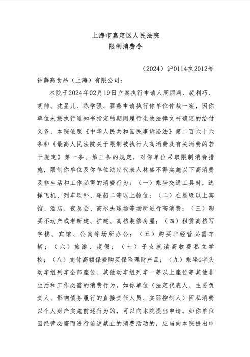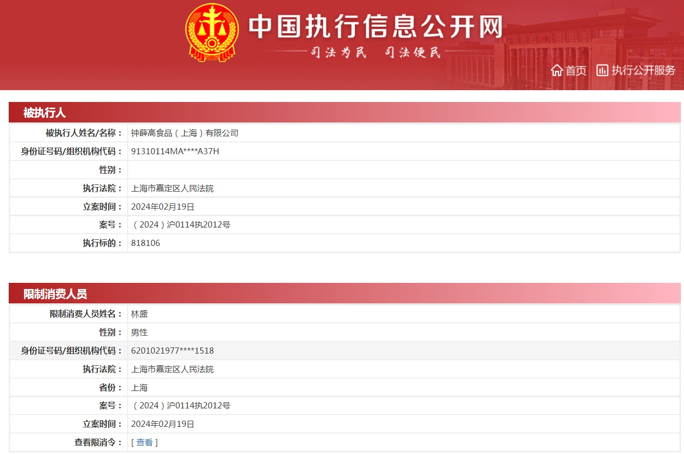 据中国执行信息公开网信息,近日,因未按执行通知书指定的期间履行生效法律文书确定的给付义务,钟薛高食品(上海)有限公司及其法定代表人林盛被限制高消费,执行法院为上海市嘉定区人民法院。关联案件流程显示,此前,该公司已成被执行人,执行标的81.81万元。此外,该公司旗下分支机构已全部注销。