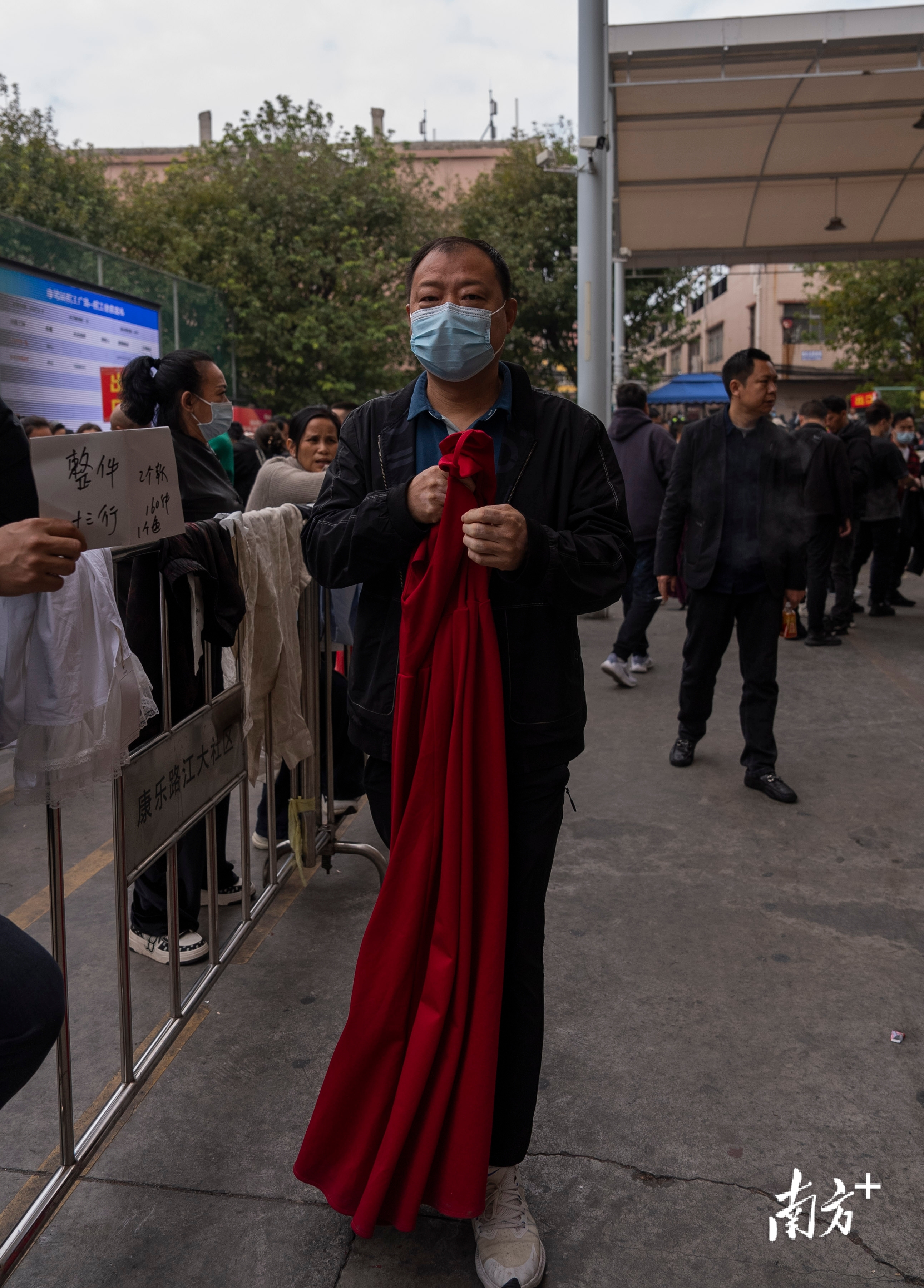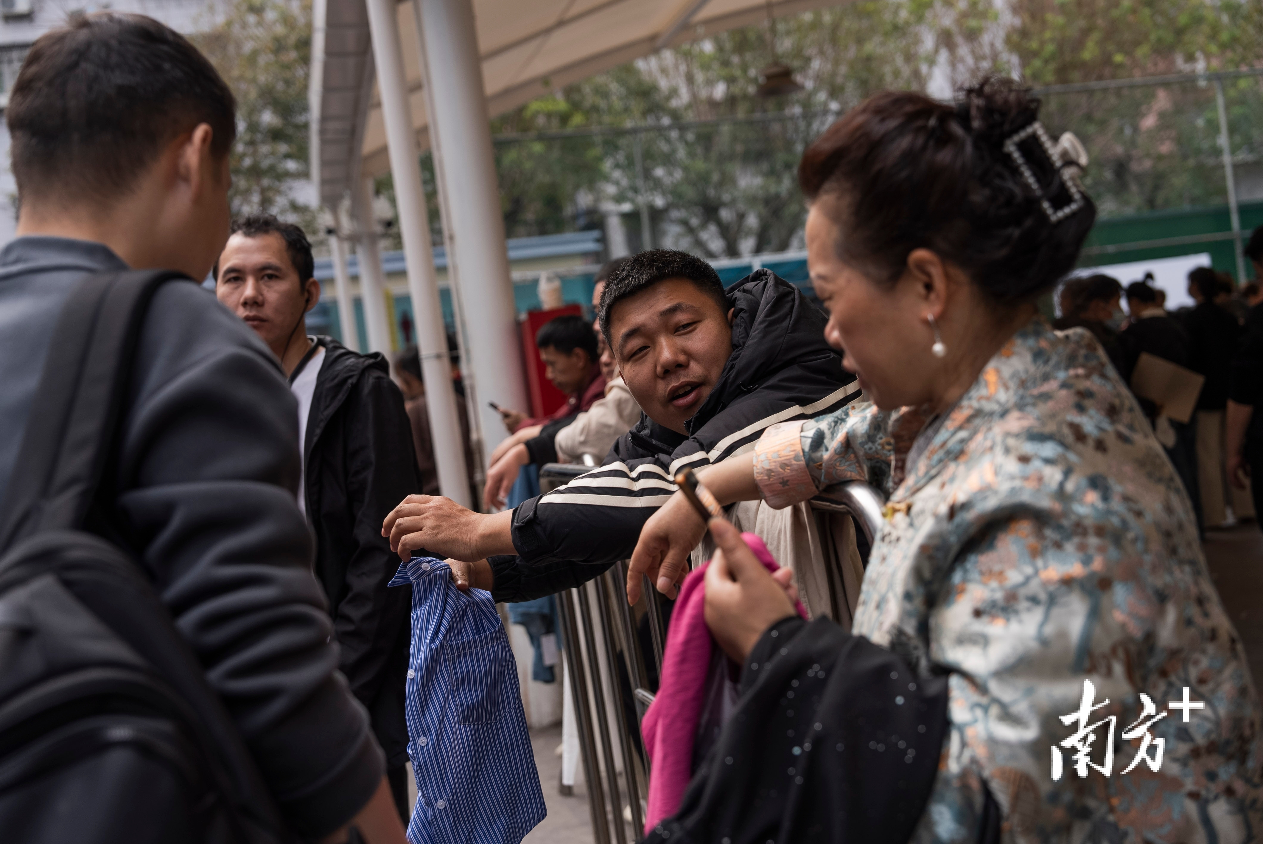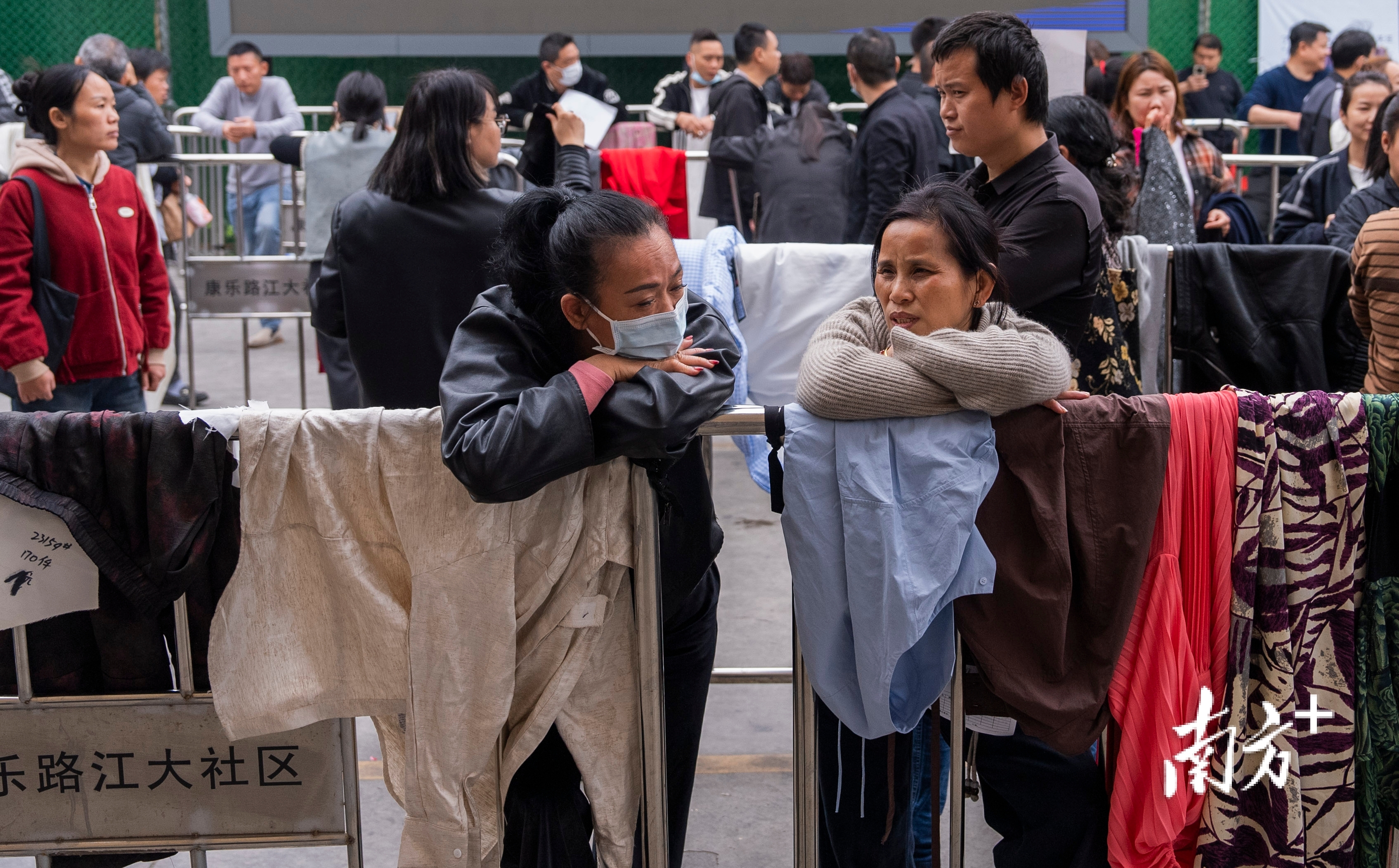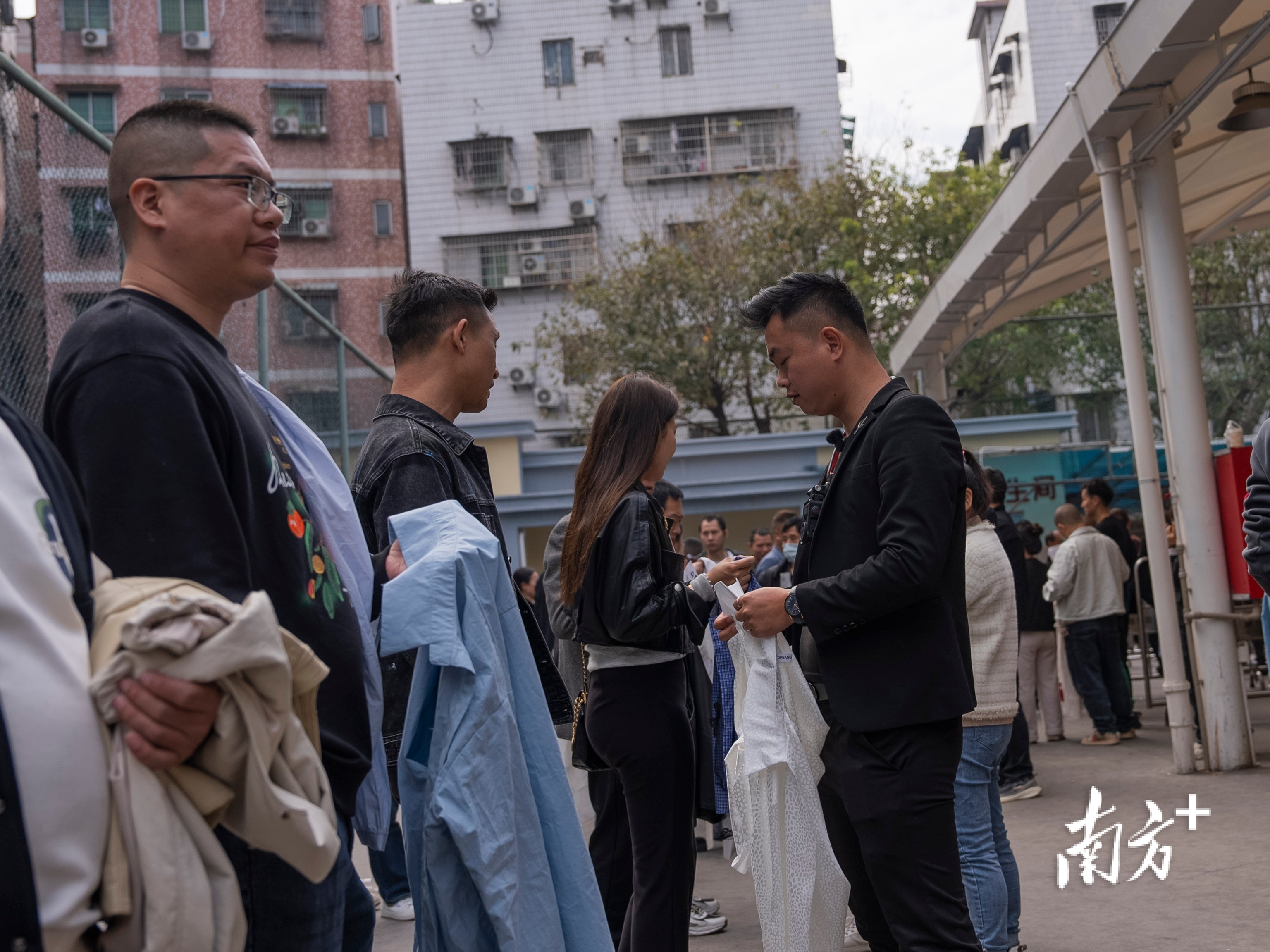 来招工广场求职的制衣工人不少都是刚从老家过完年回到广州,他们行走在两排老板之间,一边问工资,一边摸着老板手里拿的厂里要生产的样品成衣。
