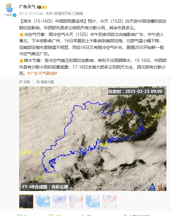 预计,15日至16日,中西部市县有分散小雨和轻雾或雾;17日至18日全省大部多云到阴天为主,西北部有分散小雨。15日至16日粤西海面和中西部市县雨雾天气导致能见度下降,17日至18日广东中东部海面风力明显加大,注意水陆交通安全;近期降水整体偏少,继续做好森林防火工作。