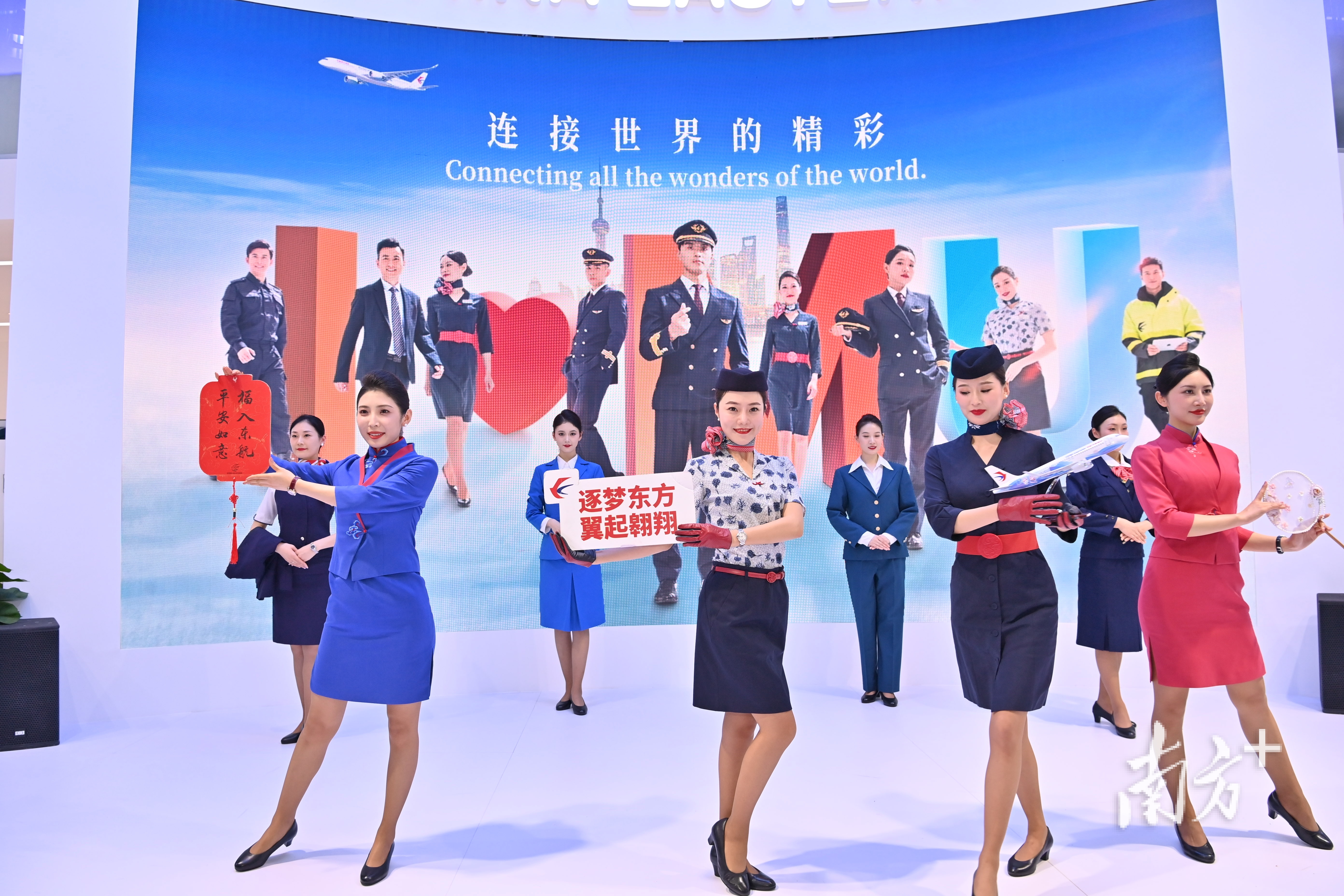 历代乘务制服的演变是中国民航发展史的重要组成部分。本次航展上,东航客舱部8位乘务员为观众带来了一场制服秀——东航第一代深蓝色军装、上世纪80年代的天蓝色制服“勇立潮头”、上世纪90年代“铜鼓袖”套装、2000年的“紫气东来 东方淑女”、如今的“海军蓝”“中国红”“青花瓷”制服,在东航乘务员的演绎下,让人仿佛穿越时空,传递东航记忆温度。