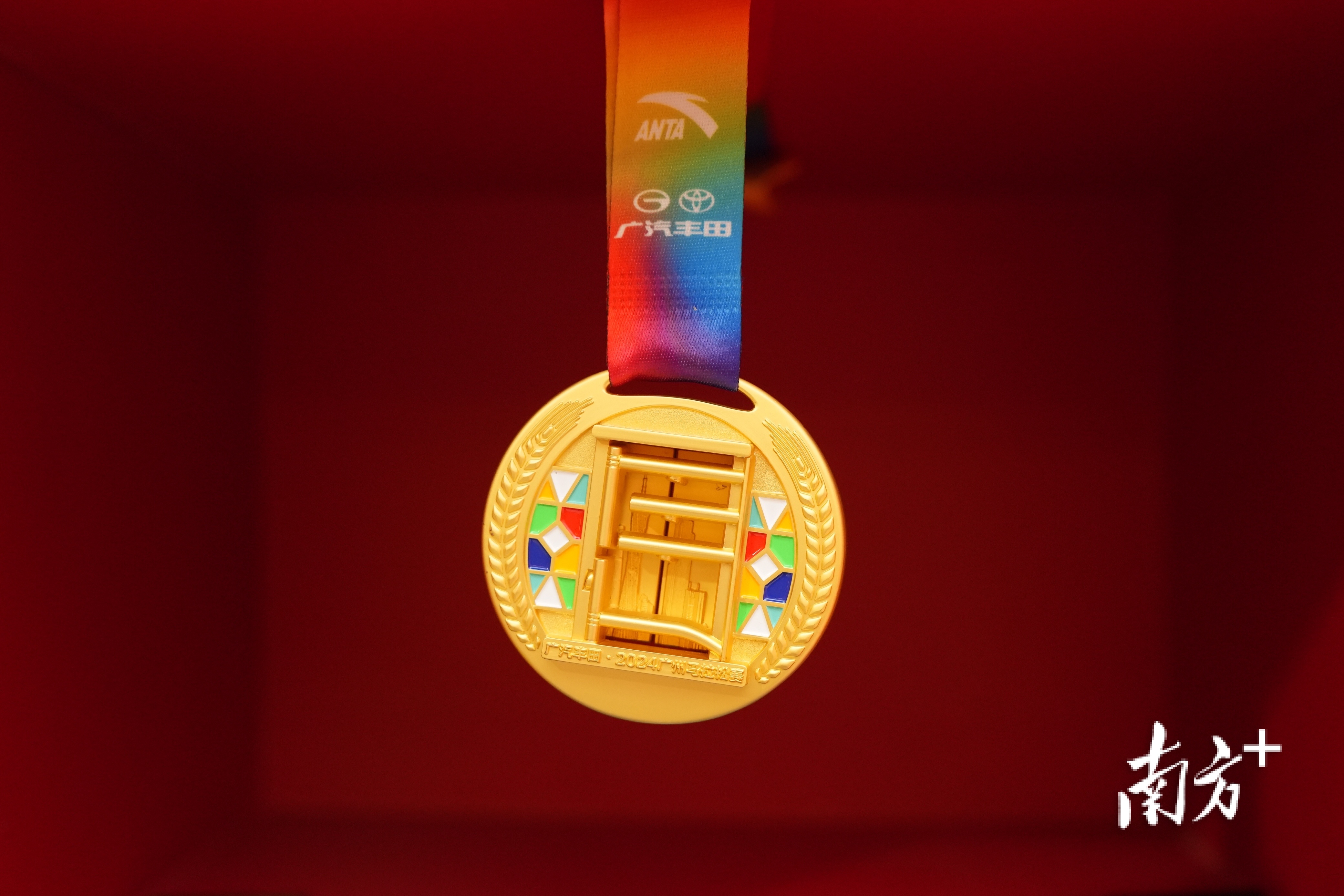 记者在现场获悉,今年广马完赛奖牌整体设计别出心裁,巧妙地融入了广州西关大屋元素,其中趟栊门的设计不仅承载着西关老街的记忆,也体现了广州城市的历史风貌。“广州”二字与趟栊门整体的结构精妙契合、浑然一体,透过趟栊门,隐约可见广州城市地标建筑群,寓意着传统文化与现代繁华之间的完美交融。
