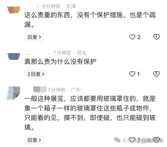 有网友说,通常此类展览都会采用玻璃罩进行保护,双方都要保护好展品。