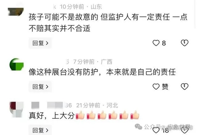 网友对此事看法不一,有人认为艺术馆应承担大部分责任,有人认为监护人应负责。此事提醒人们外出时要照看好孩子,教育孩子明白现实道理。