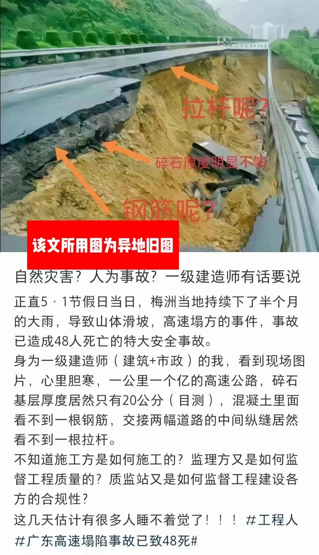 5月1日2时许,梅大高速茶阳路段发生塌方灾害,引发社会关注。网络上有自称为“一级建造师”的网友发布帖子称,通过塌方“现场图”可以发现,塌方路面的碎石基层厚度目测只有20厘米,混凝土里看不到一根钢筋,且交接两幅道路的中间纵缝看不到一根拉杆。该帖子还配上一张有相关标识的“现场图”,引发热议。