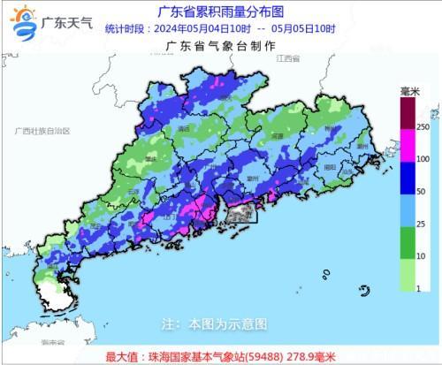 天气实况:5月4日白天到5日早晨,广东大部出现了大雨到暴雨,局部大暴雨,珠海录得局地特大暴雨。据监测,04日10时到05日10时,全省平均雨量46.3毫米,超过25毫米镇街占全省总镇街数的80.3%,有4个镇街录得超过250毫米的特大暴雨,有133个镇街录得100毫米~250毫米的大暴雨,有541个镇街录得50毫米~100毫米的暴雨,有577个镇街录得25毫米~50毫米的大雨,各市雨量最大的镇街有:珠海香洲区狮山街道278.9毫米、中山坦洲镇243.2毫米、江门恩平市河排林场189.4毫米、深圳南山区蛇口街道178毫米、清远连南瑶族自治县大麦山镇169.6毫米。