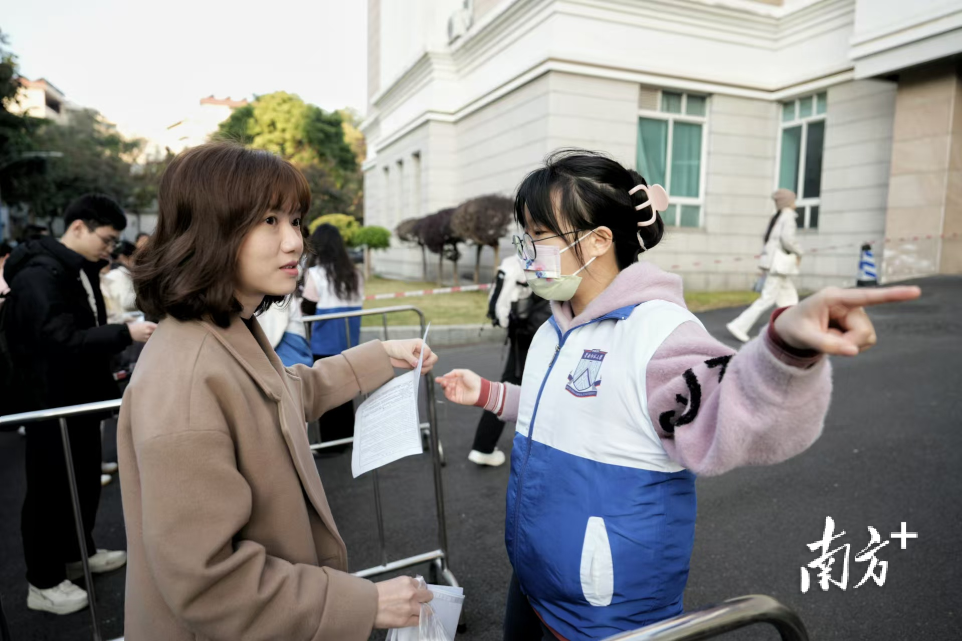为保障考试顺利进行,华南师范大学考点外,数名身着制服的安保人员维护着考生入场和安检的秩序。现场还设置了志愿服务站,为考生提供考点指引和咨询服务。正值降温天气,中山大学考点设置了医疗服务岗位,为考生的健康护航。