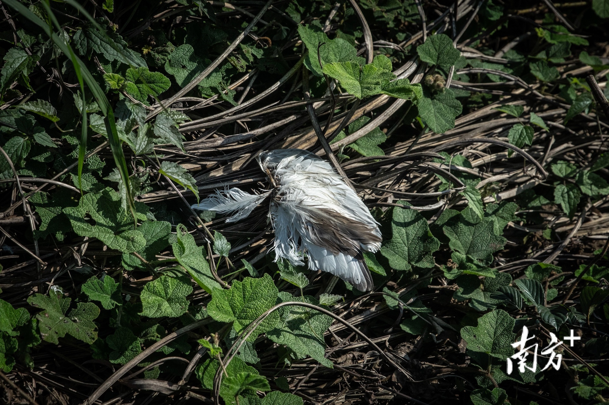 山坡上散落的鹭鸟羽毛。 南方+ 董天健 拍摄