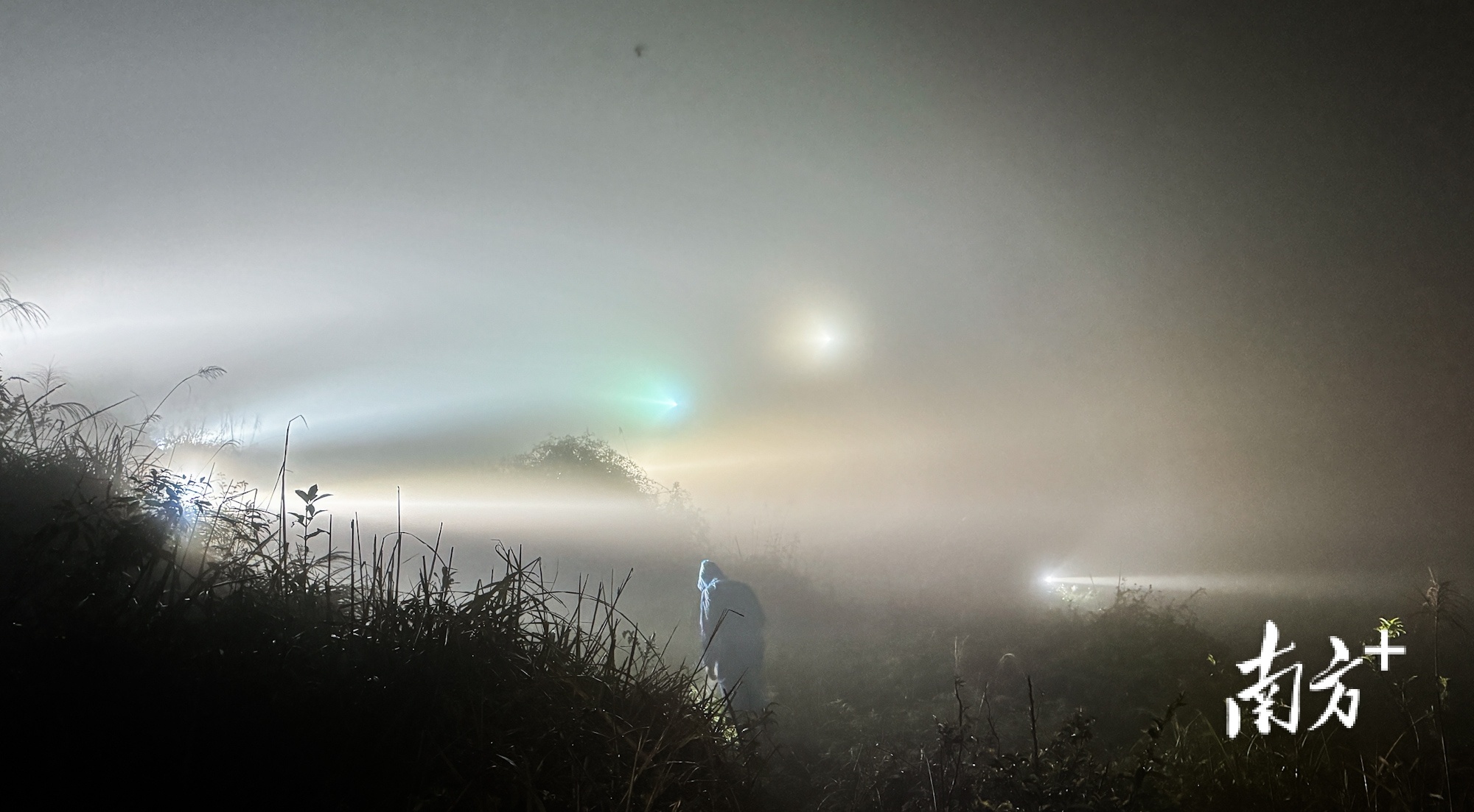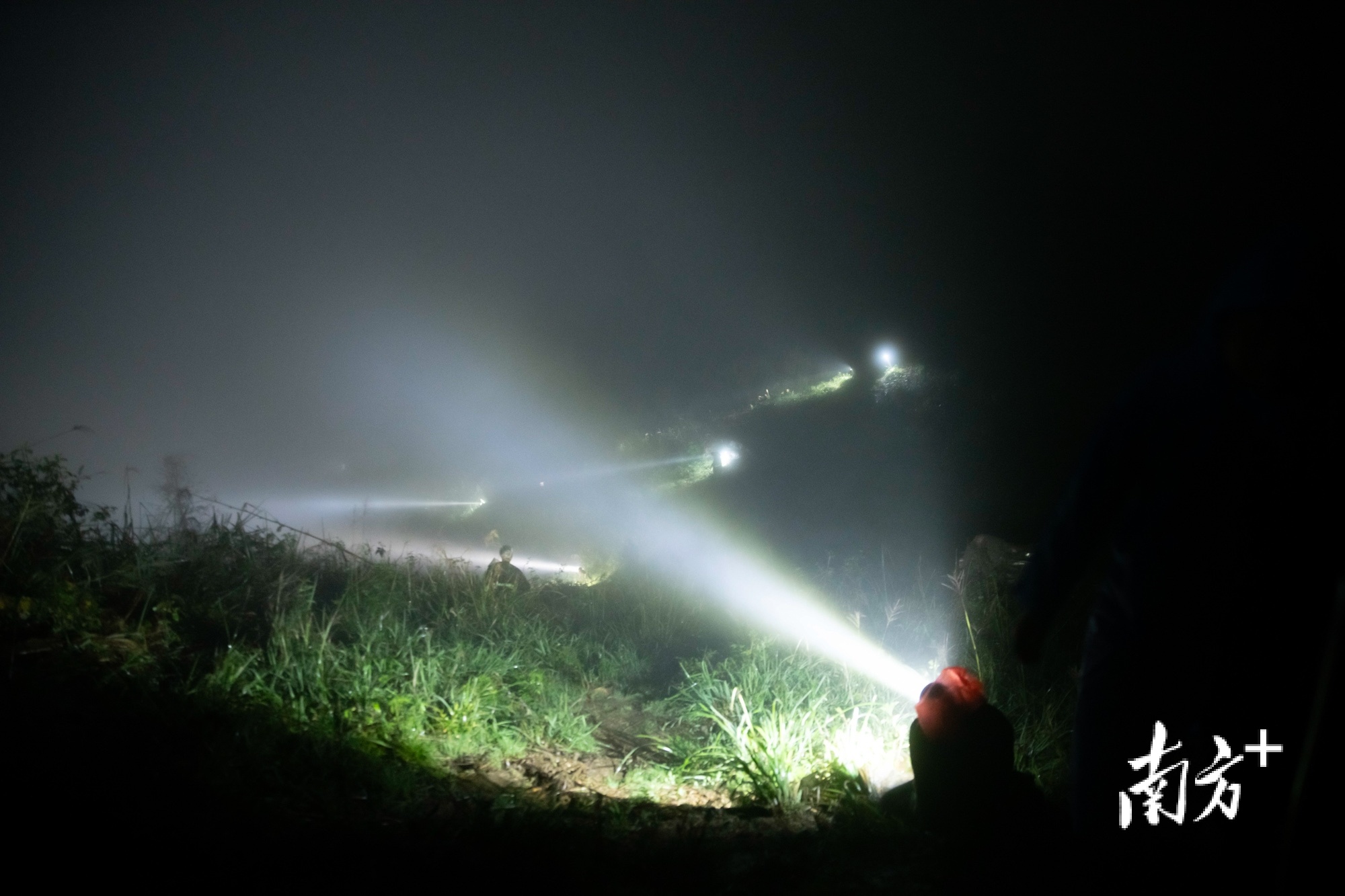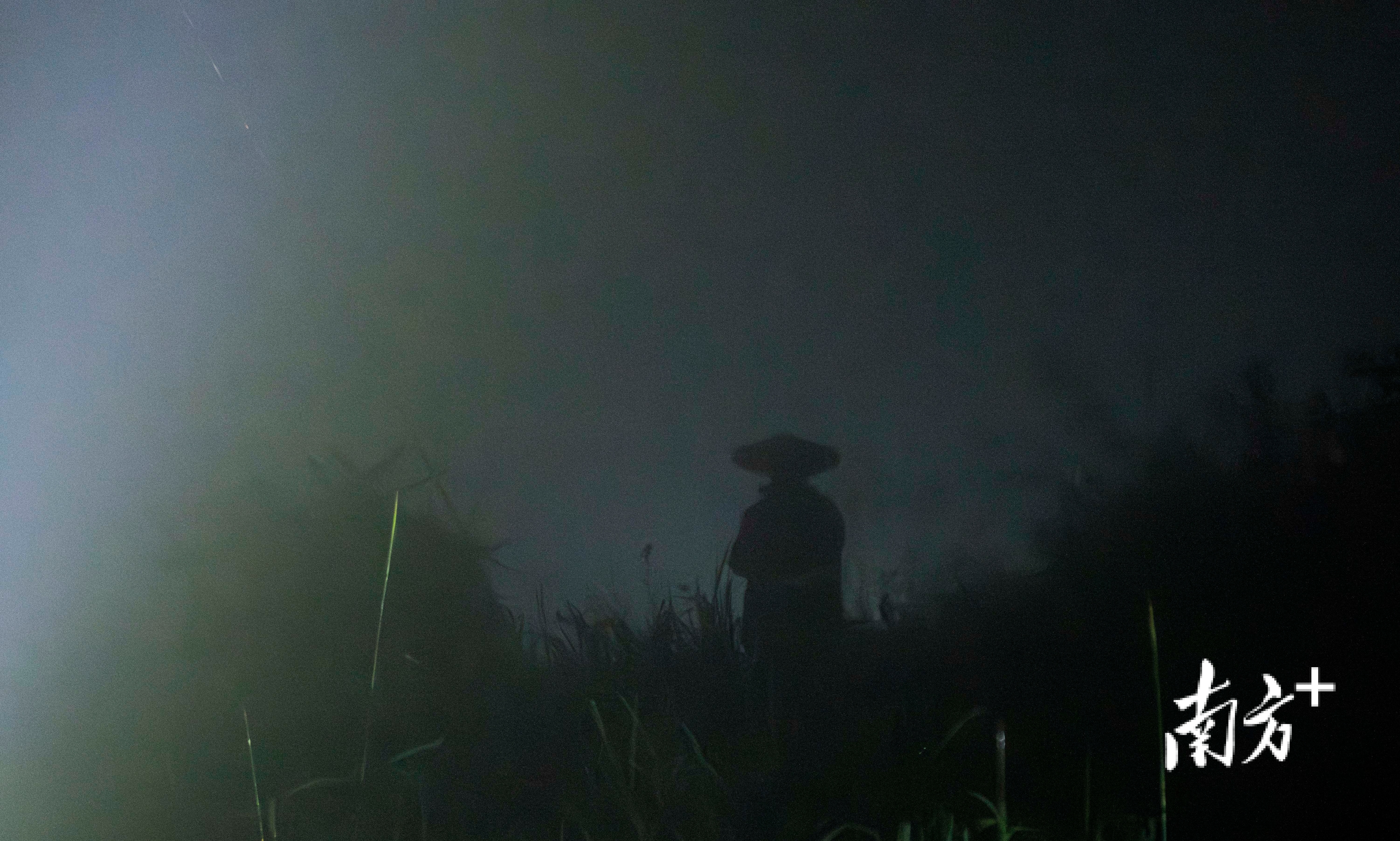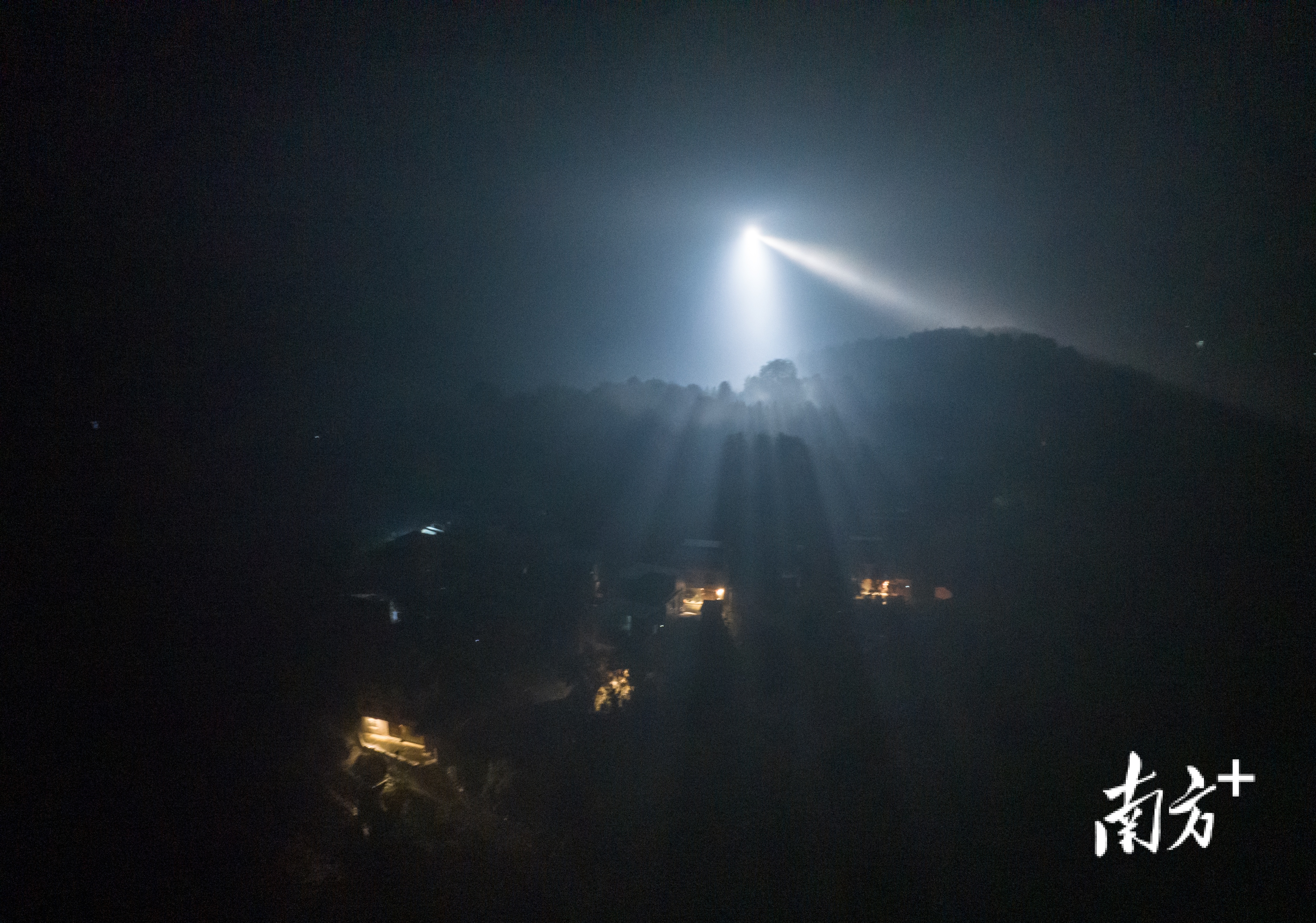 夜间,捕鸟者将多个山头照亮。 南方+ 董天健 拍摄