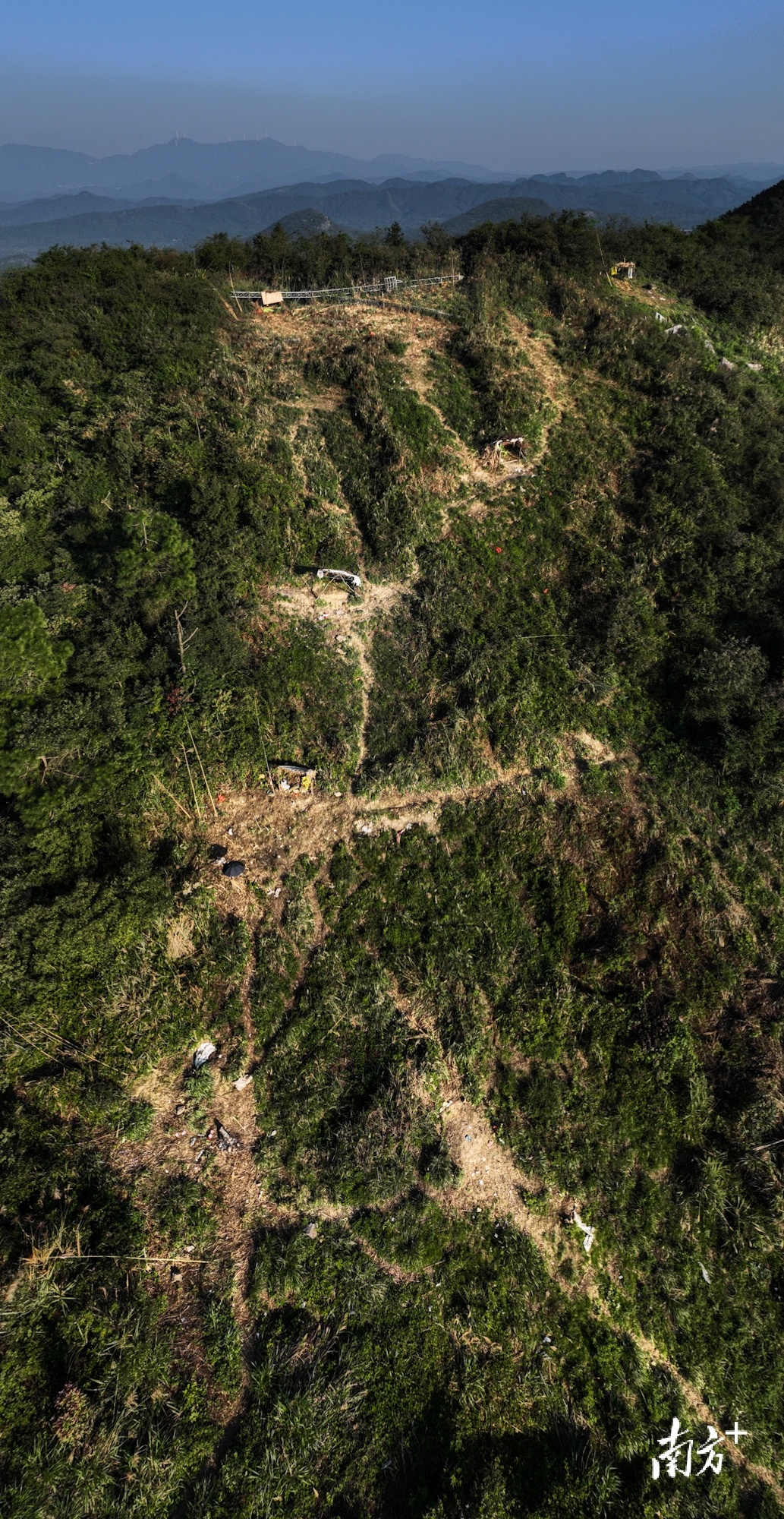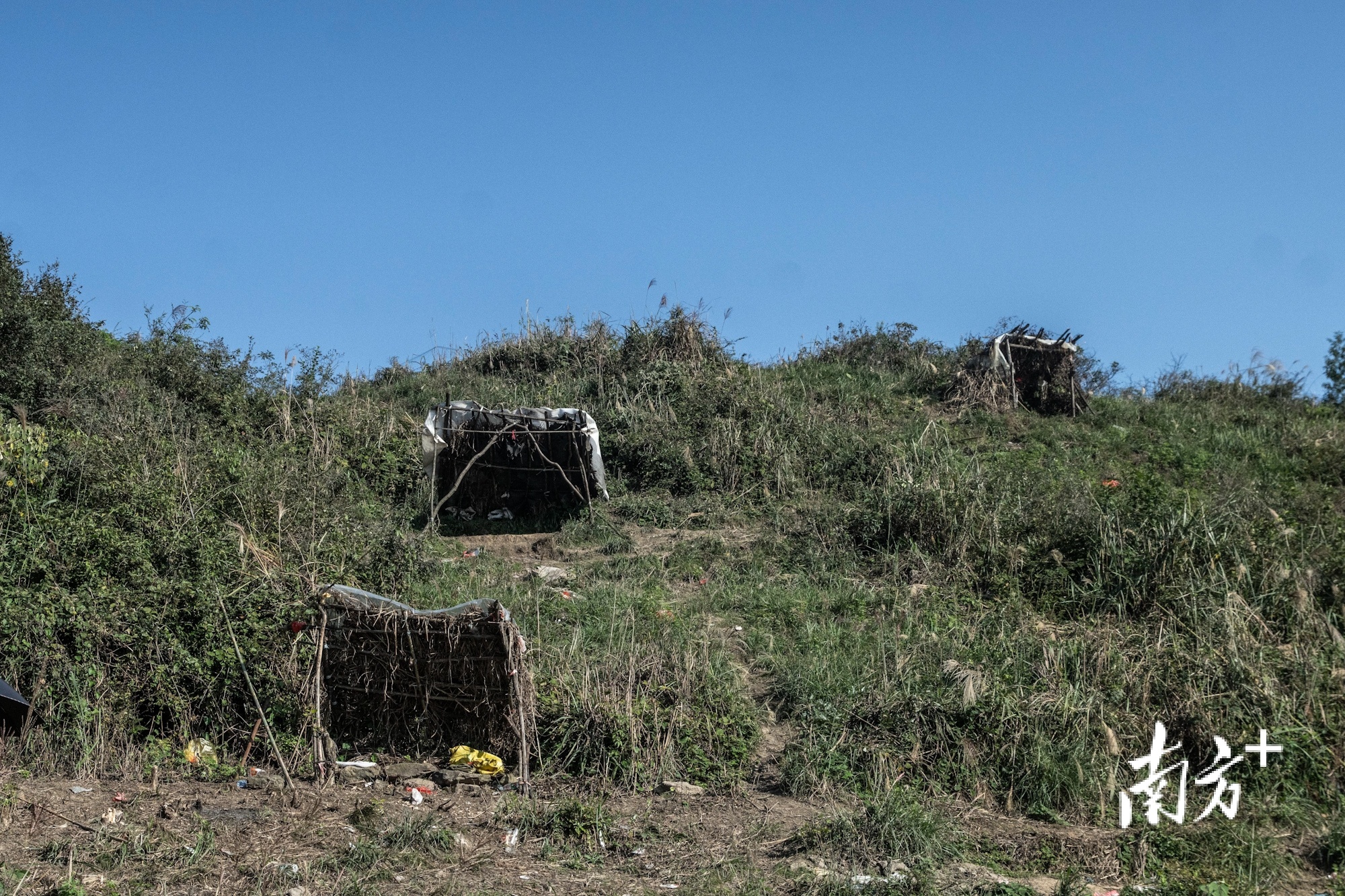 湖南永州大庆坪乡,盗猎者在山坡上搭建捕鸟窝棚。因鸟类多在雨雾天气出现,密密麻麻的窝棚说明该处有大量盗猎活动。 南方+ 董天健 拍摄