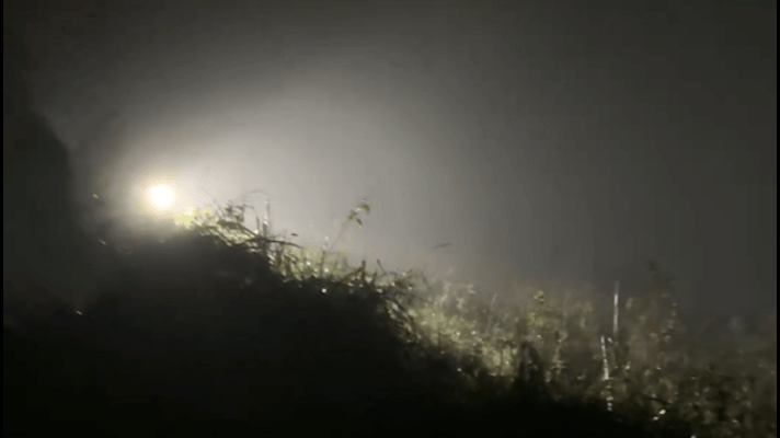 10月19日晚,记者在打鸟现场看到,从晚上6点到10点,陆续有捕鸟人上山。当日雨雾较大,能见度较低,难以看到山坡情况。而在候鸟进山的晚上8时、11时整点前后,原本漆黑的山坡突然被十余束强光照得通亮。