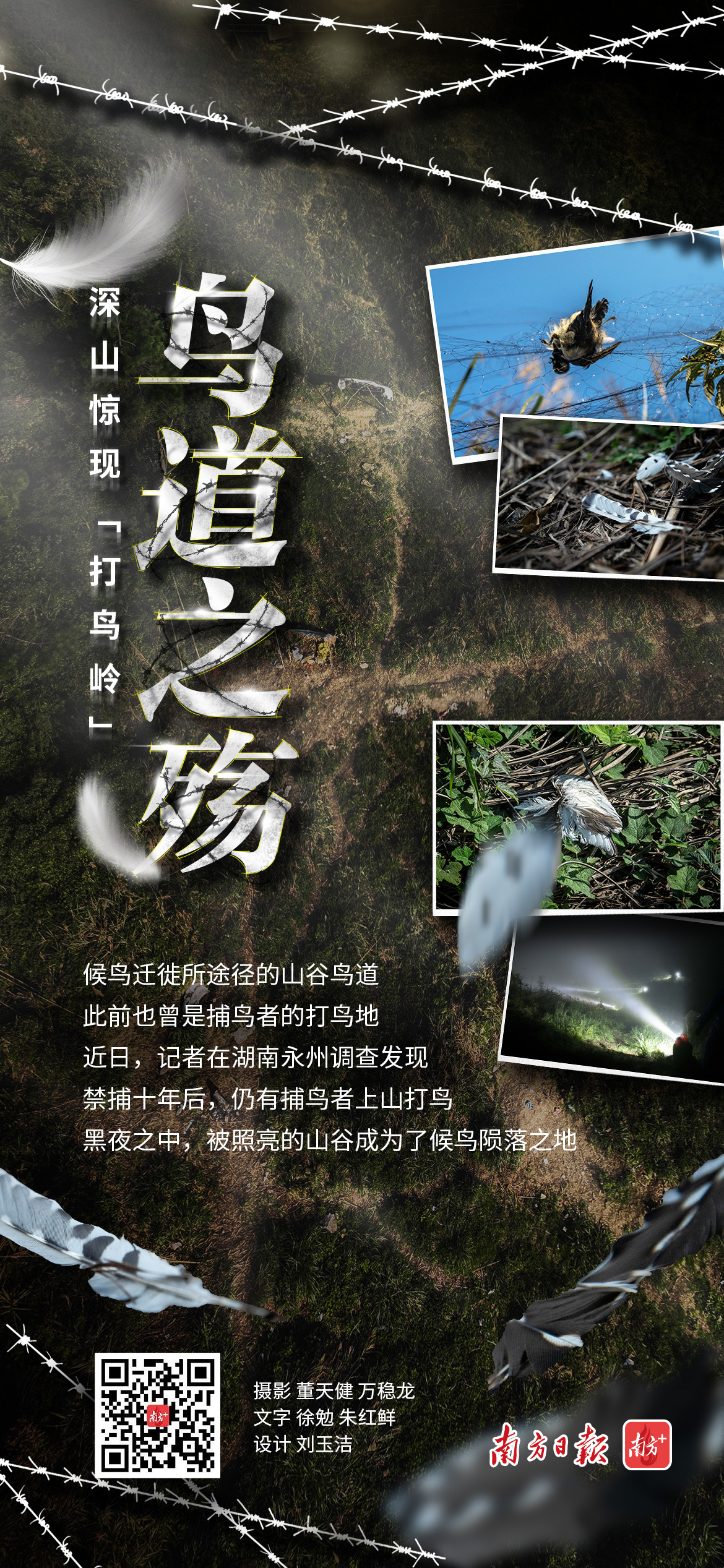深夜,山谷,微雨淅沥,白鹭慢慢低飞。谷中闪烁的光芒和鸟鸣告诉它,前方正是小憩的去处。迁徙了一天,它需要在谷底稍作休整,再继续南下。但危险早已在此等待。咕咕叫声并非来自同伴,而是捕鸟人的“号子”。待它靠近灯光,一根竹竿嗖地抽下……