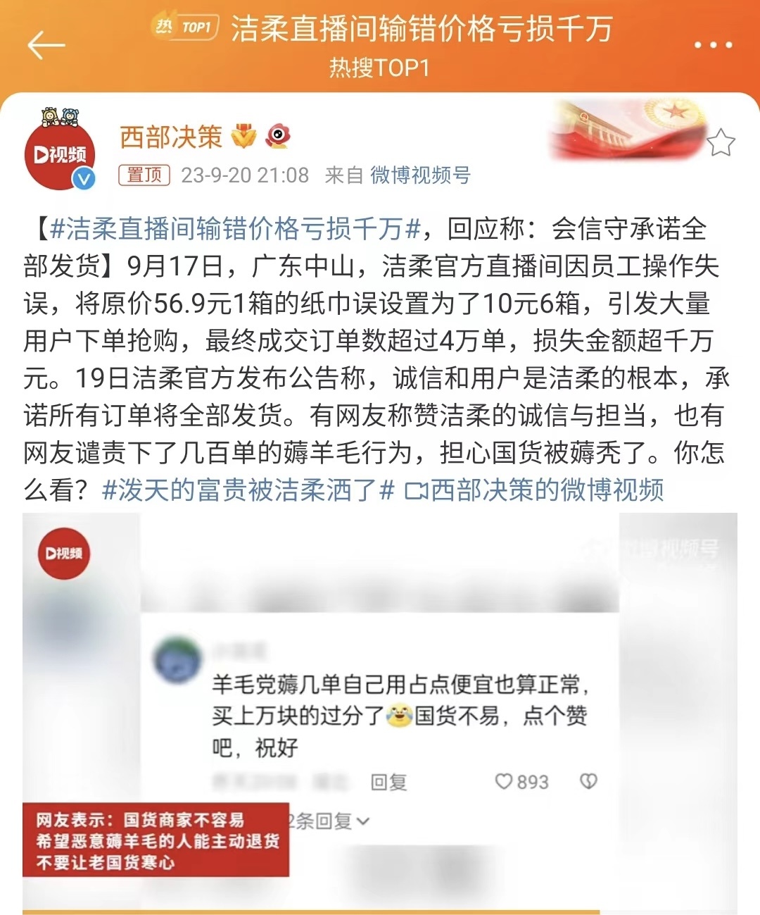 9月17日,在广东中山起家的一家国货品牌中顺洁柔,其官方直播间因员工操作失误,将原价56.9元1箱的纸巾误设置为了10元6箱,引发大量用户下单抢购。最终成交订单数超过4万单,损失金额超千万元。