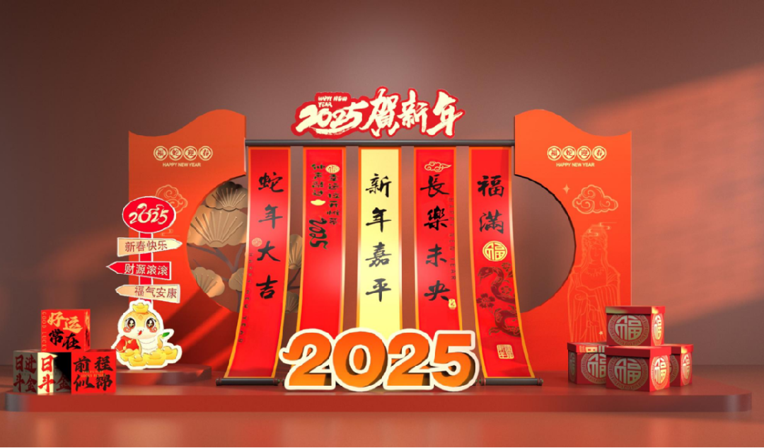 2025金蛇迎春,生动可爱的“金蛇”吉祥物立于眼前,眉眼带笑,憨态可掬,仿佛在为每一个来往的行人送去新春祝福,祝他们“蛇来运转,新春大吉”!
