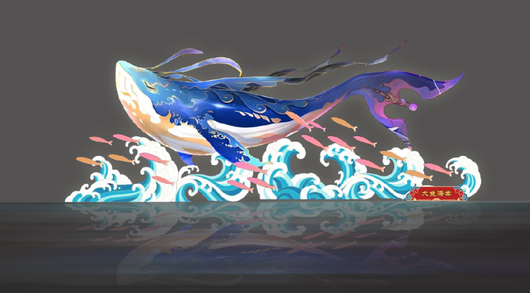 大鱼海棠灯组以深海巨鱼为设计灵感,灯组中巨鱼遨游,小鱼相伴,浪花随之翻涌,灯组蓝光萦绕,仿佛将观众带入了神秘的海底世界,感受大自然的浩瀚与奇妙。