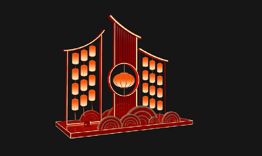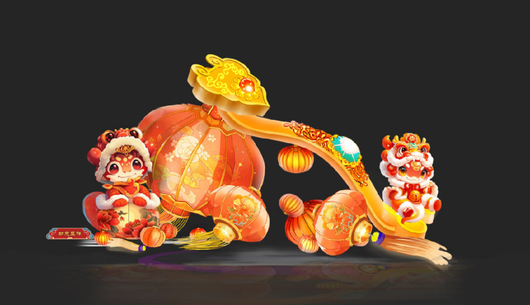 如意呈祥灯组,顶端的鎏金如意展翅高飞,象征着万事如意。下方,栩栩如生的蛇形造型灵动,在大红灯笼的映衬下,弥漫着浓浓的节庆团圆气息,渲染出春节的喜悦与和谐美好。