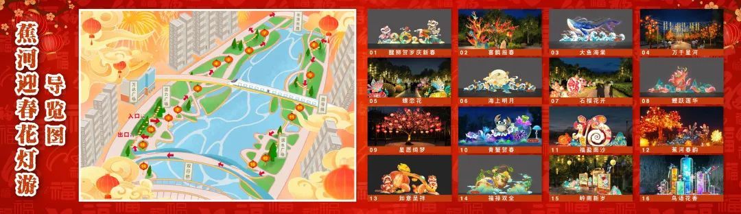 此次蕉河迎春花灯游通过16组匠心独具的灯组设计,将传统春节文化与现代艺术创意巧妙融合,交织出一幅春意盎然、光影交辉的浪漫画卷。