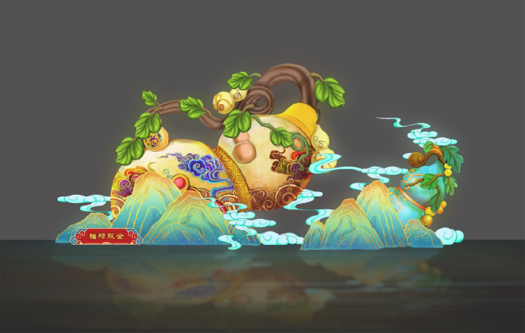 福禄双全灯组以一对巨型葫芦灯为设计主体,暖黄灯光下,青云环绕,宛如为葫芦添上了飞升的翅膀,寓意着福禄双全,祈愿新年充满幸福、富贵与吉祥。