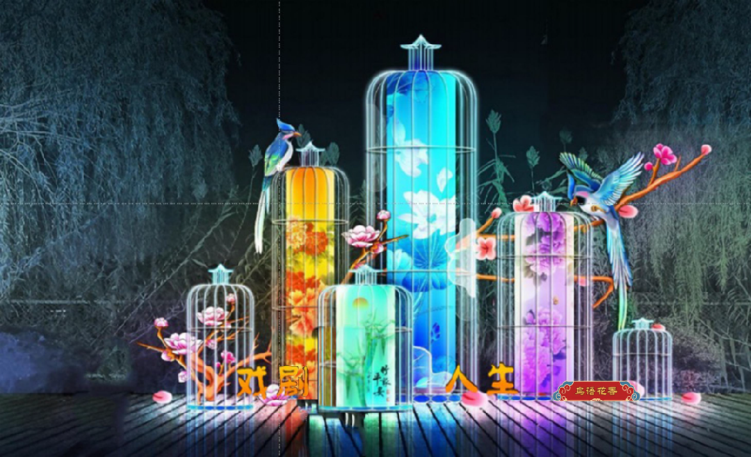 鸟语花香灯组将鸟儿与繁花争艳的景象描绘得栩栩如生,传递出新春的蓬勃气息和团圆美满的寓意。