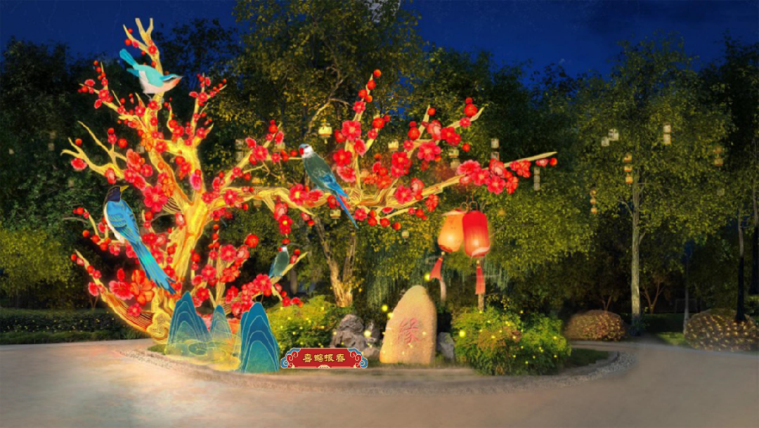 喜鹊报春灯组以翩翩起舞的喜鹊和盛开的梅枝为元素,仿佛春风吹拂大地,传递着“春回大地,万物更新”的希望与生机。
