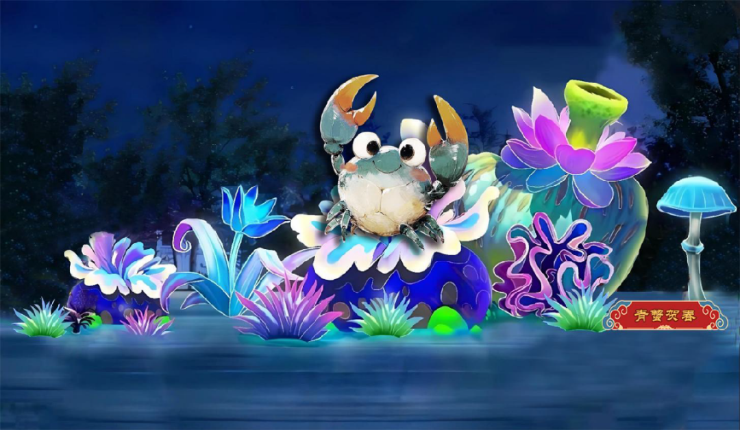 青蟹贺春灯组描绘了南沙特有的青蟹跃动的画面,展现这片土地的自然活力,象征着盎然勃发的生命力与希望。