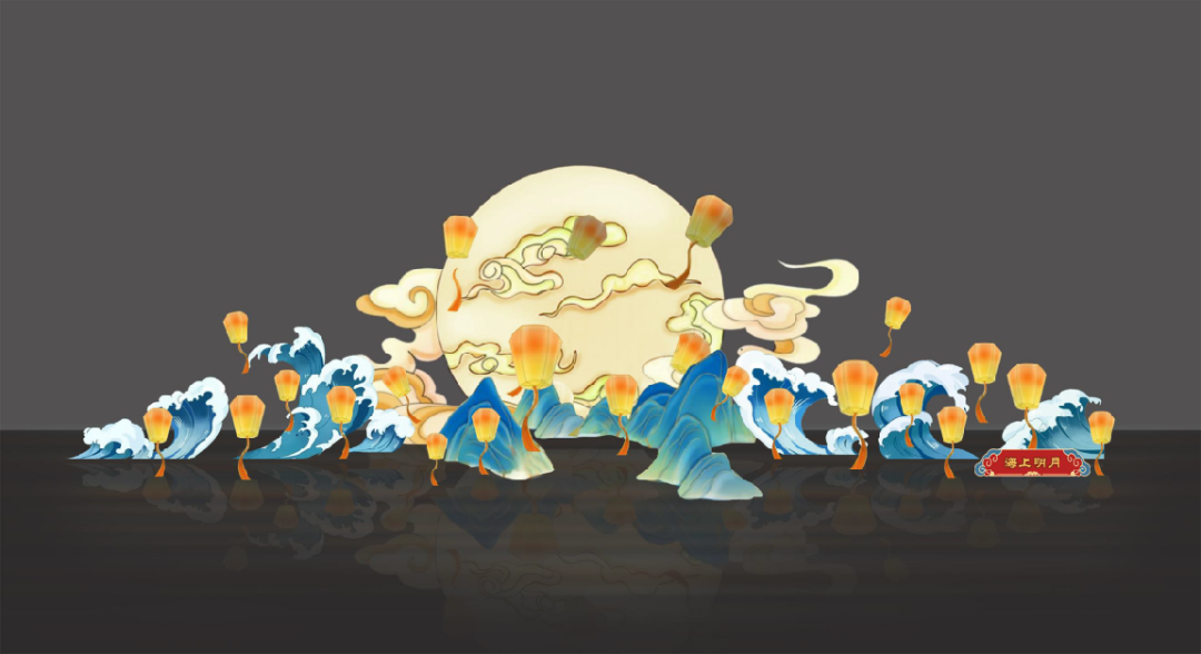 海上明月灯组以皎洁的明月高悬天际,翻涌的海浪在蓝光的映衬下生动逼真,周围点缀的孔明灯飘然升空,营造出一幅浪漫祥和的画面。