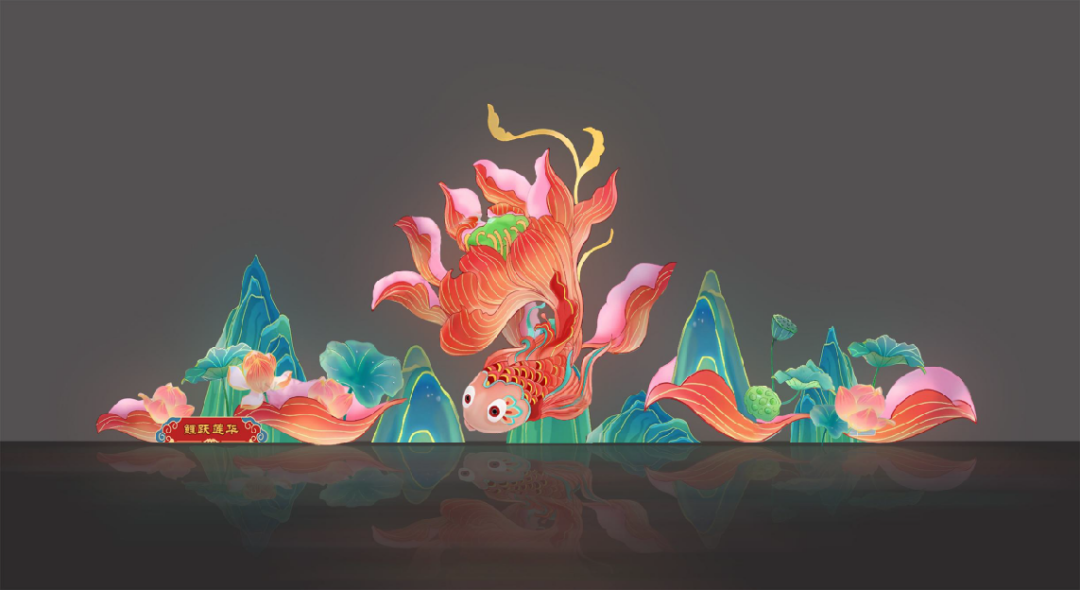 鲤跃莲华灯组通过灵动的鲤鱼与盛开的莲花交相辉映,象征吉祥如意、顺风顺水,跃动的鲤鱼仿佛穿越波涛而来,将美好的新春祝福送到每一位市民游客心中。