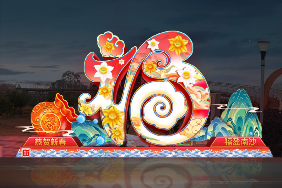 福盈南沙灯组以巨型福字为主体,金红色的光芒洒满四周,象征着幸福、富贵与团圆,寄托着对新一年美满幸福的美好祝愿,带来满满的喜庆与吉祥。