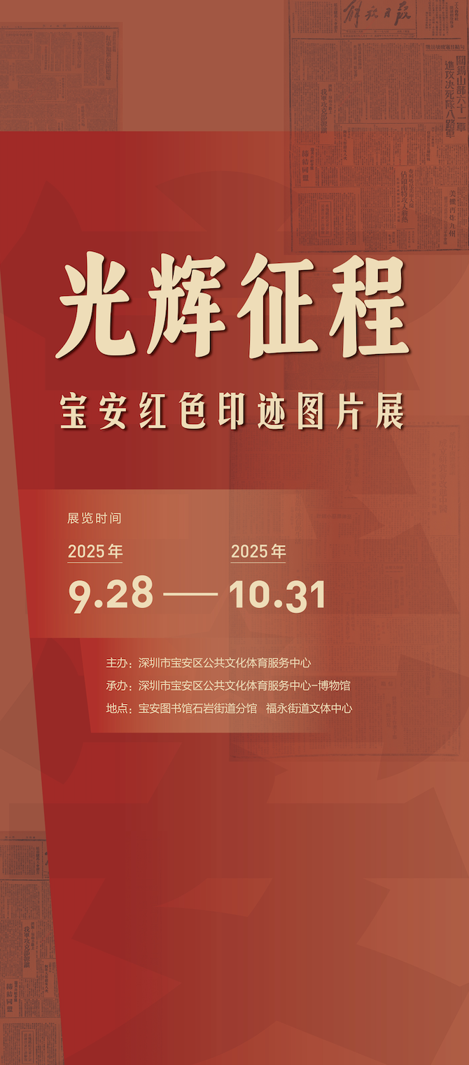 • 宝安美术馆从9月22日起办“名家宝安行”展览,能近距离看全国名家的作品;石岩、福永片区还会开红色印迹图片展,跟着老照片回顾革命故事。