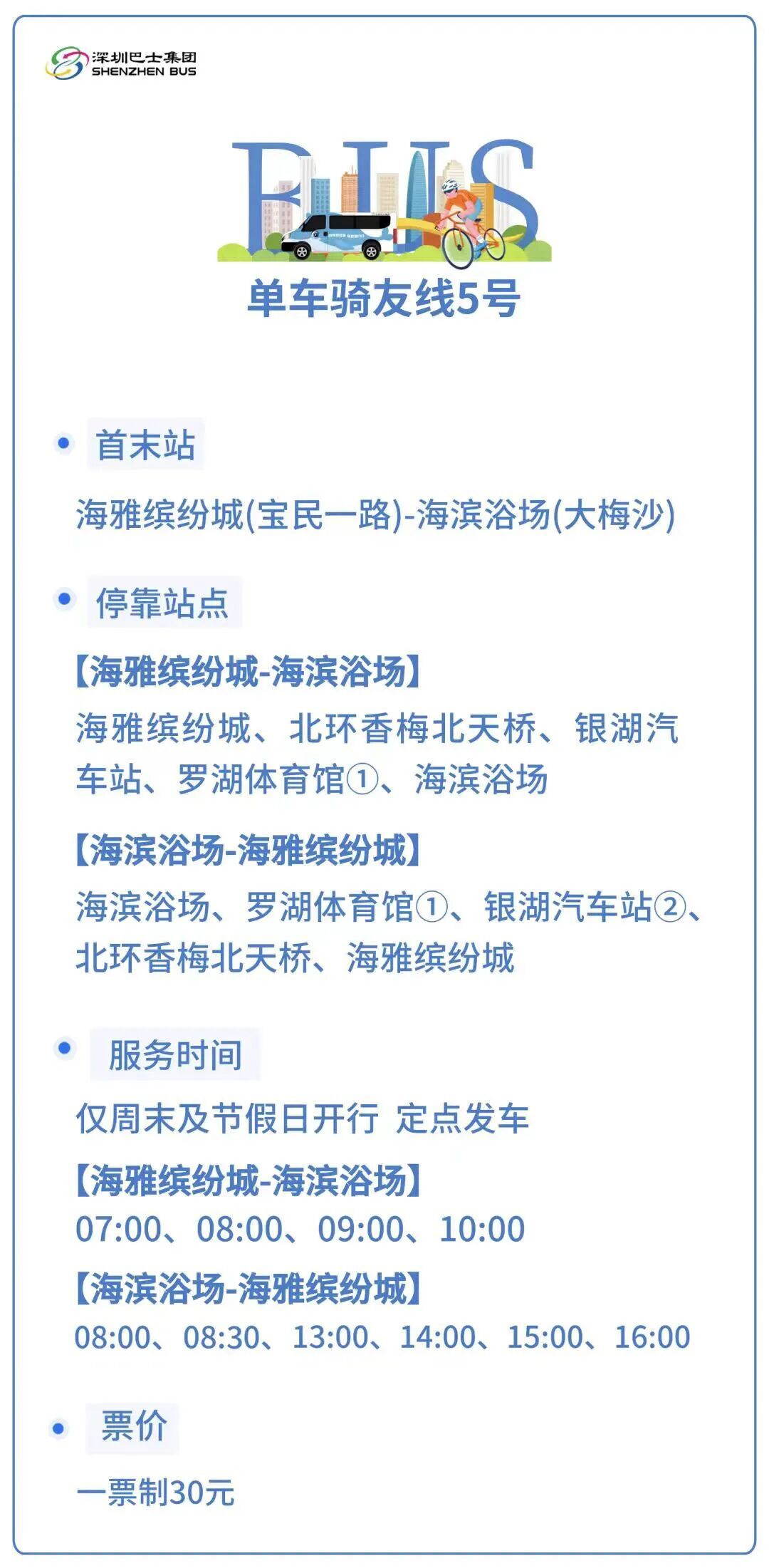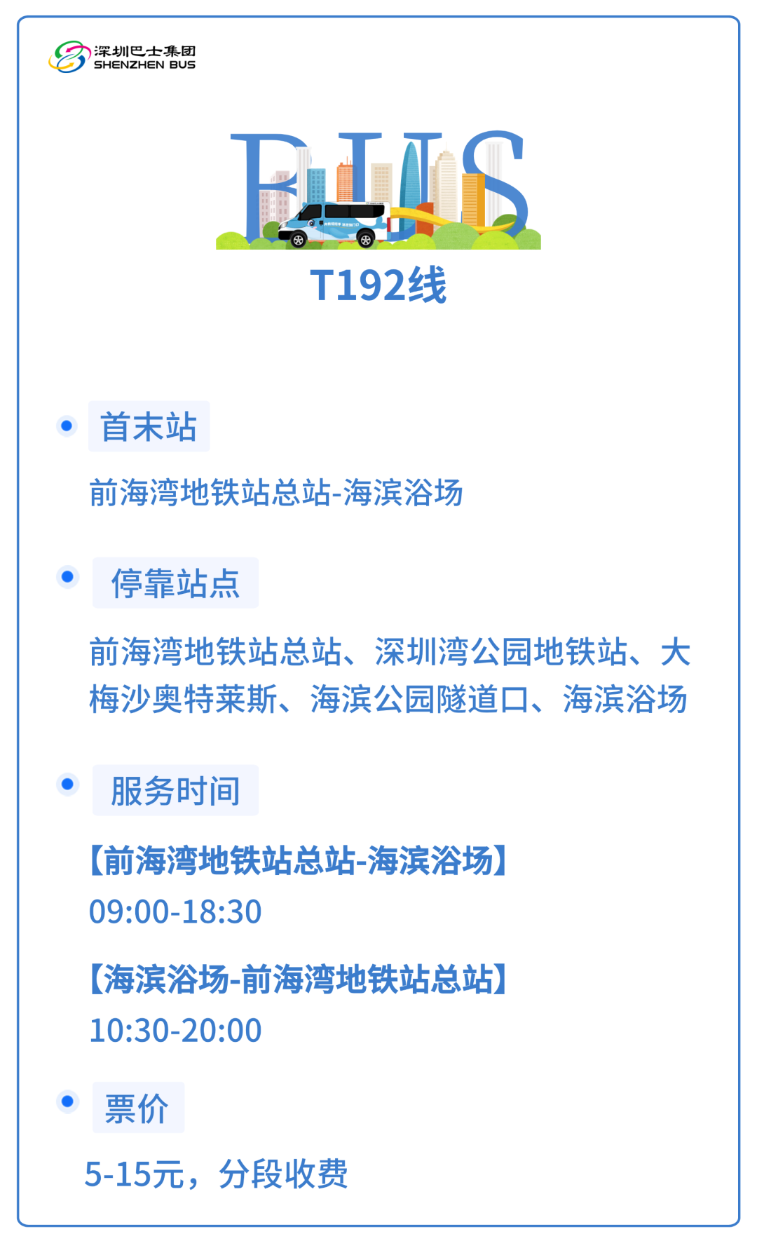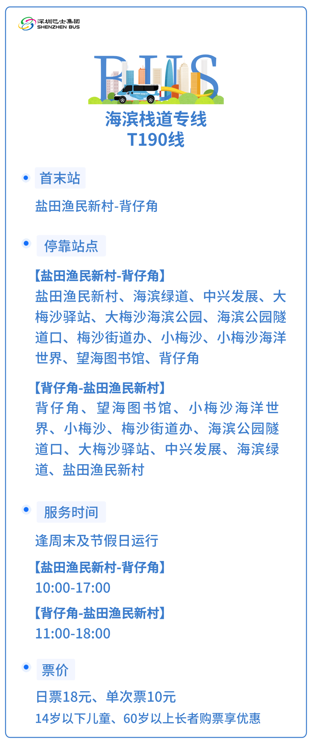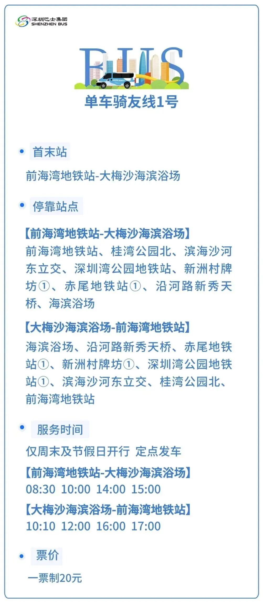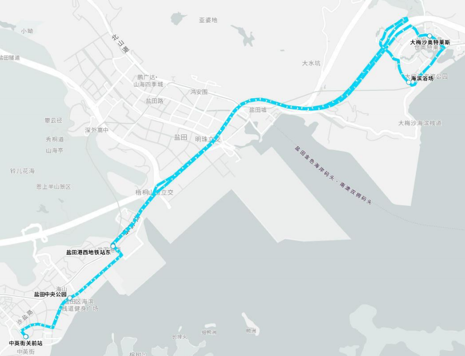 停靠站点:中英街关前站、盐田中央公园(壹海城)、盐田港西地铁站东(B出口)、大梅沙8号仓、海滨浴场、盐田港西地铁站东(B出口)、盐田中央公园(壹海城)、中英街关前站