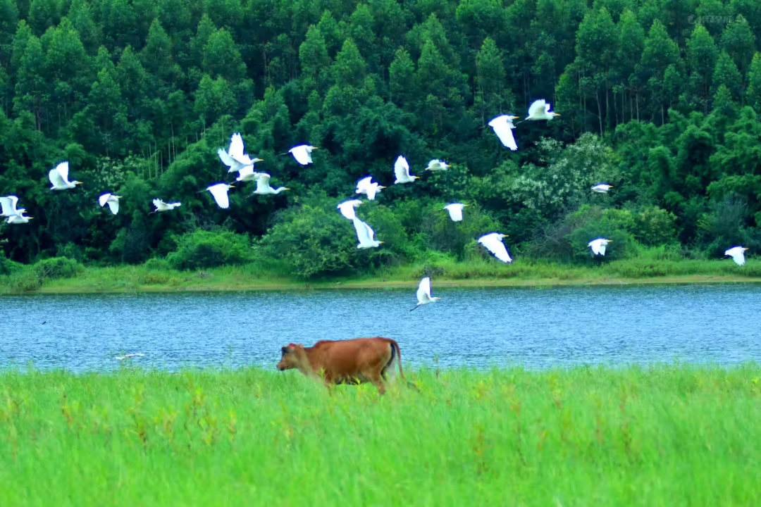 在湖畔草地与白鹭嬉戏