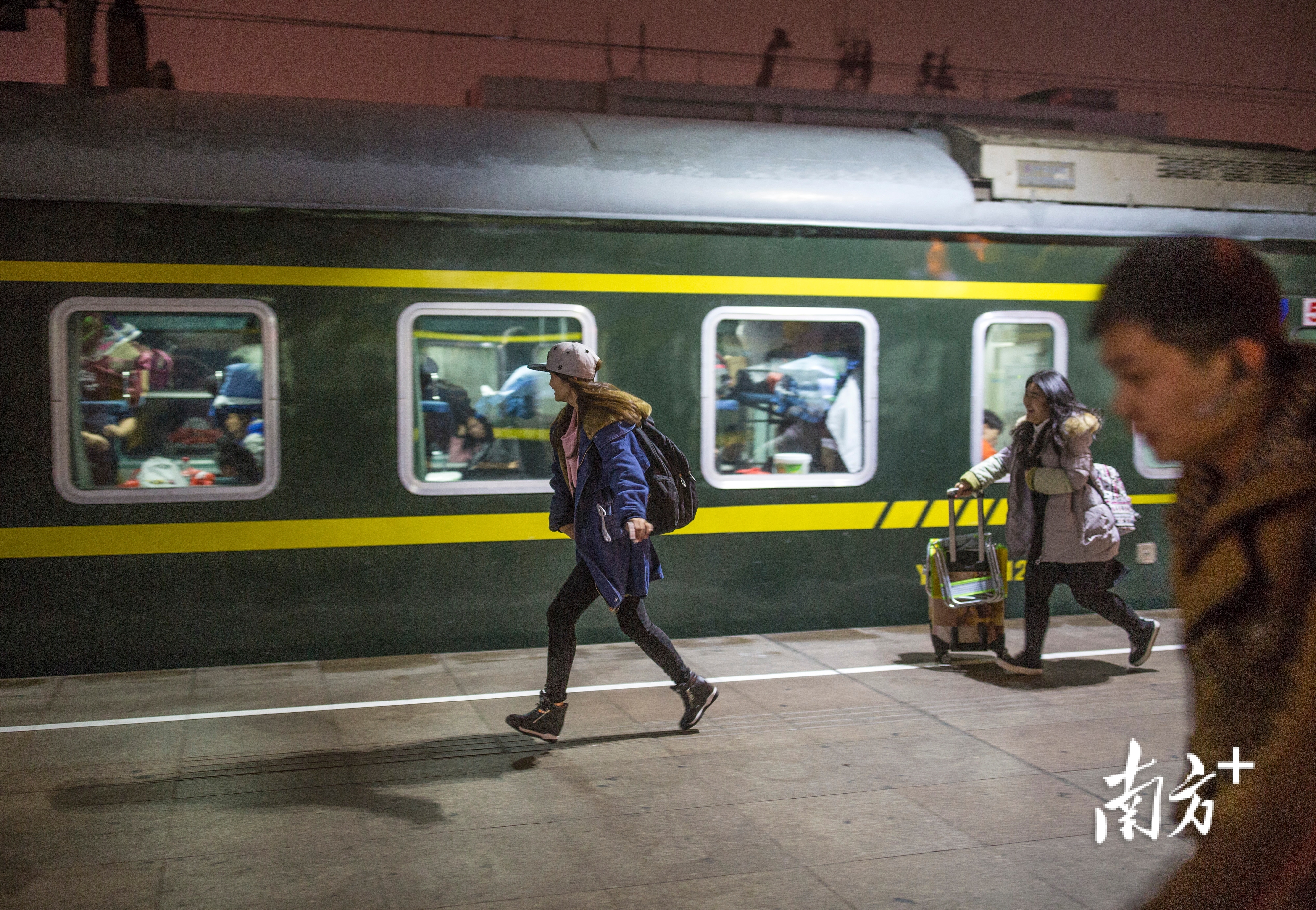 2017年1月16日,广州火车站,绿皮火车停靠在站台,两名年轻女子在月台上飞奔。南方日报记者 张由琼 万稳龙 摄