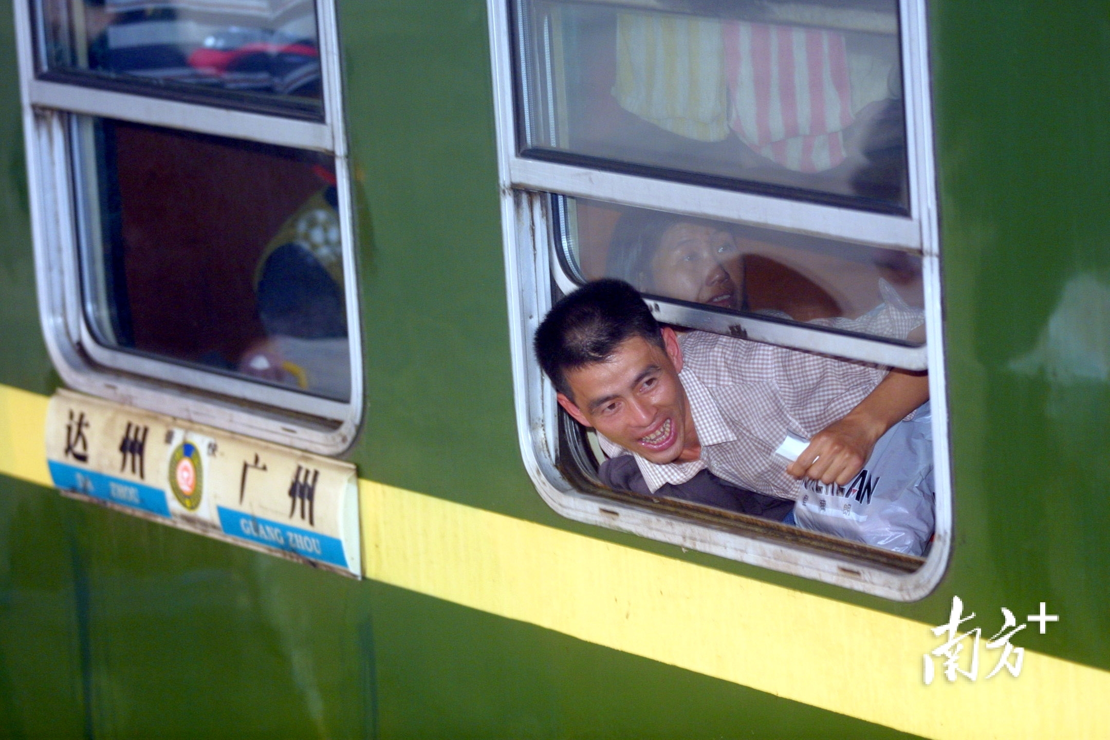 2004年1月,广州火车站,一位成功登上车的旅客从车窗探出身体兴奋地对着还在车下的同伴喊叫。陈军 摄