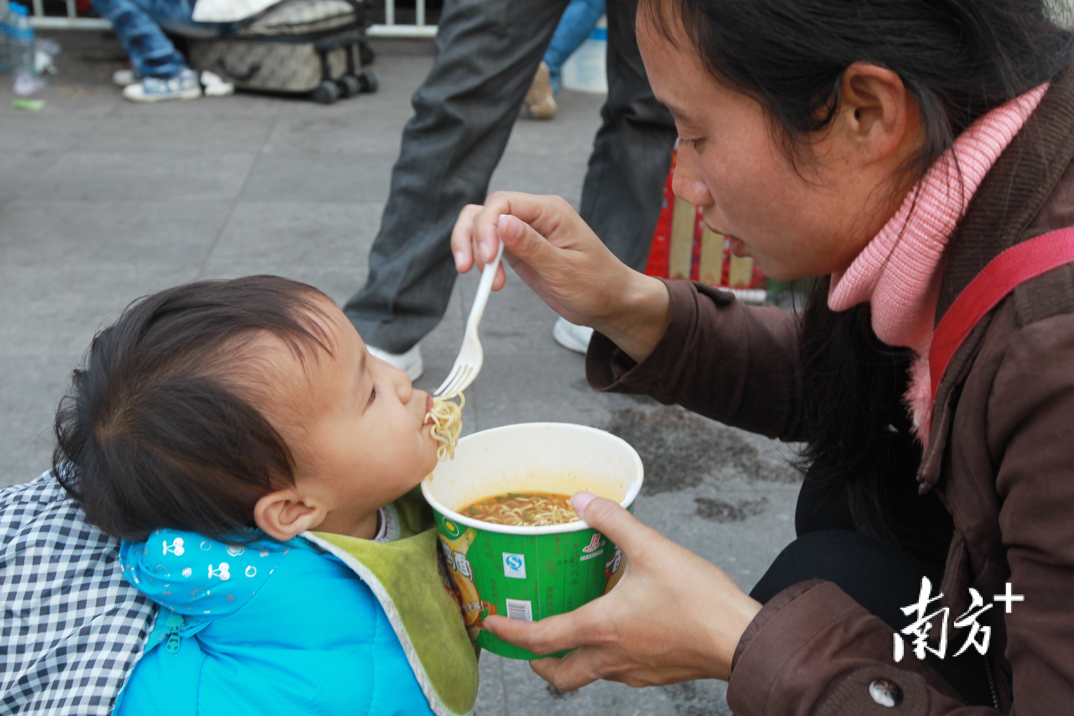 2013年春运,广州火车站候车大厅,一位母亲喂孩子吃方便面。南方日报记者 梁文祥 摄
