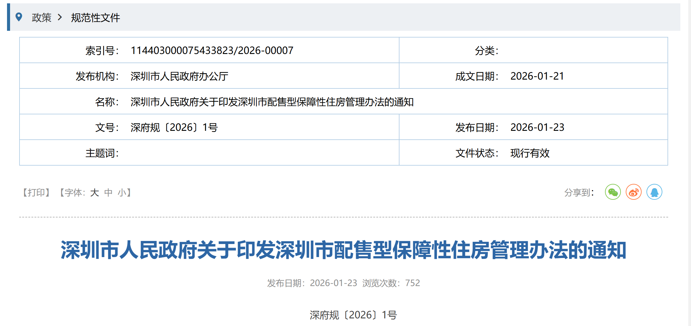 1月23日,深圳发布《深圳市配售型保障性住房管理办法》(以下简称《办法》)。《办法》将于2026年3月1日起施行。