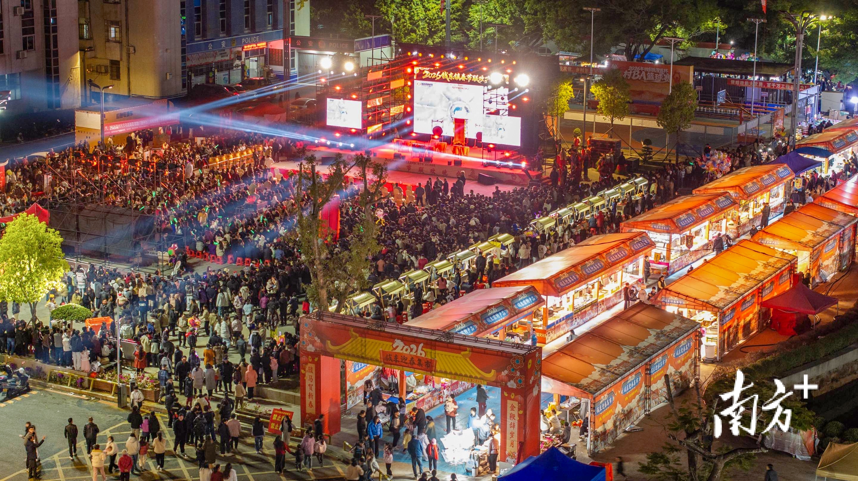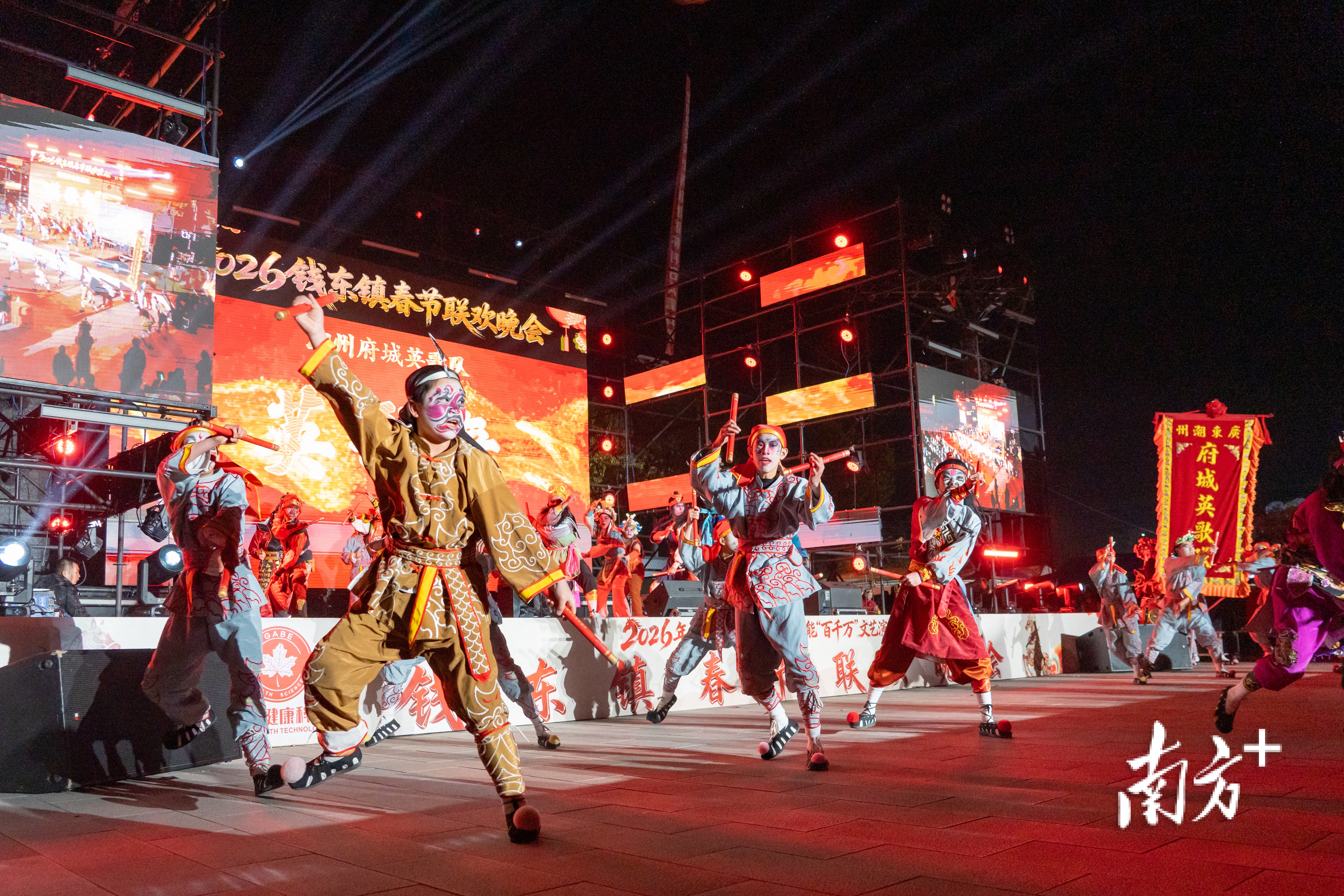腊月廿一,饶平县钱东镇政府前的广场上张灯结彩。一曲潮州大锣鼓响彻夜空,晚会正式开场;舞台下,近千张椅子座无虚席,晚来的观众在外围踮脚张望。不远处,迎春集市灯火通明,小吃摊升腾着诱人的热气。