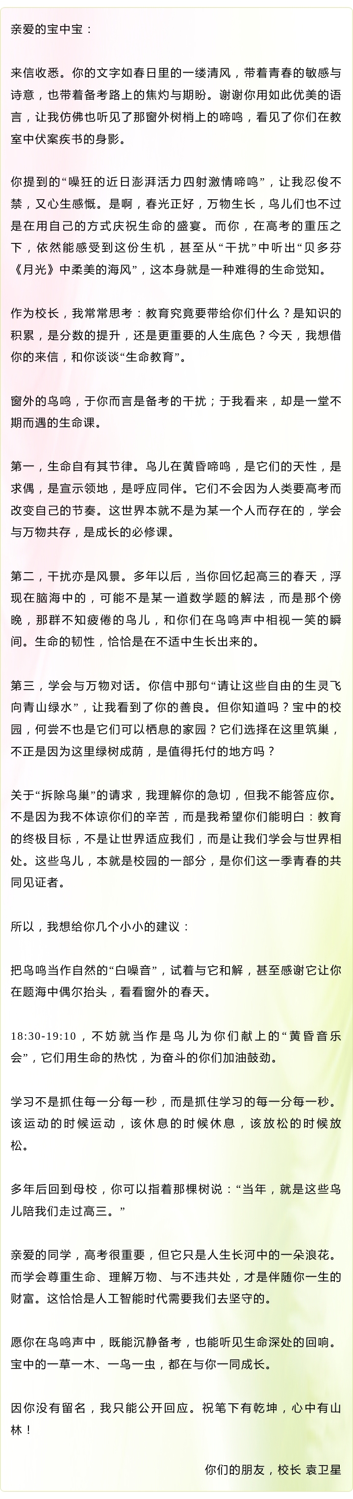 信中写道:“声声啼鸣虽算不上震耳欲聋、嘈杂刺耳,却以高频穿透力,如同《月光奏鸣曲》里轻柔的海风,一遍遍将同学们在‘思维沙滩’上精心搭建的思路沙堡抚平、冲淡、融化。”