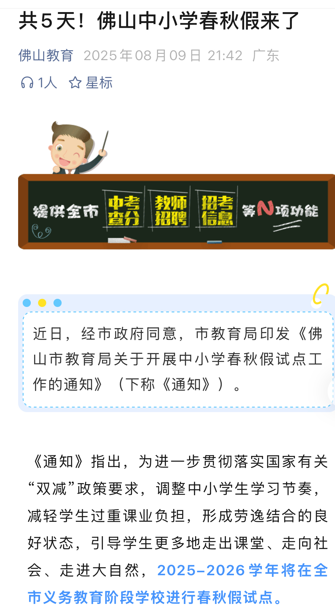 8月9日,佛山市教育局发布试点中小学春秋假的通知。